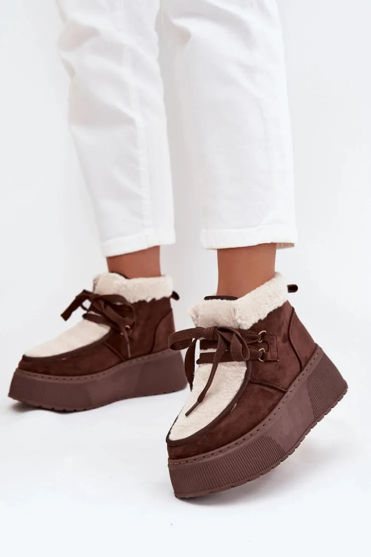 Śniegowce damskie wykonane z miękkiego eko zamszu to idealny wybór na zimowe dni. Model wsuwany ze sznurowaniem świetnie dopasowuje się do stopy, a wnętrze ocieplane futerkiem gwarantuje ciepło i wygodę. Osadzone na solidnej platformie, skutecznie izolują od chłodnego podłoża. To praktyczne i stylowe obuwie, które doskonale sprawdzi się w codziennych, zimowych stylizacjach. Przy wyborze rozmiaru prosimy sugerować się tabelą rozmiarów.