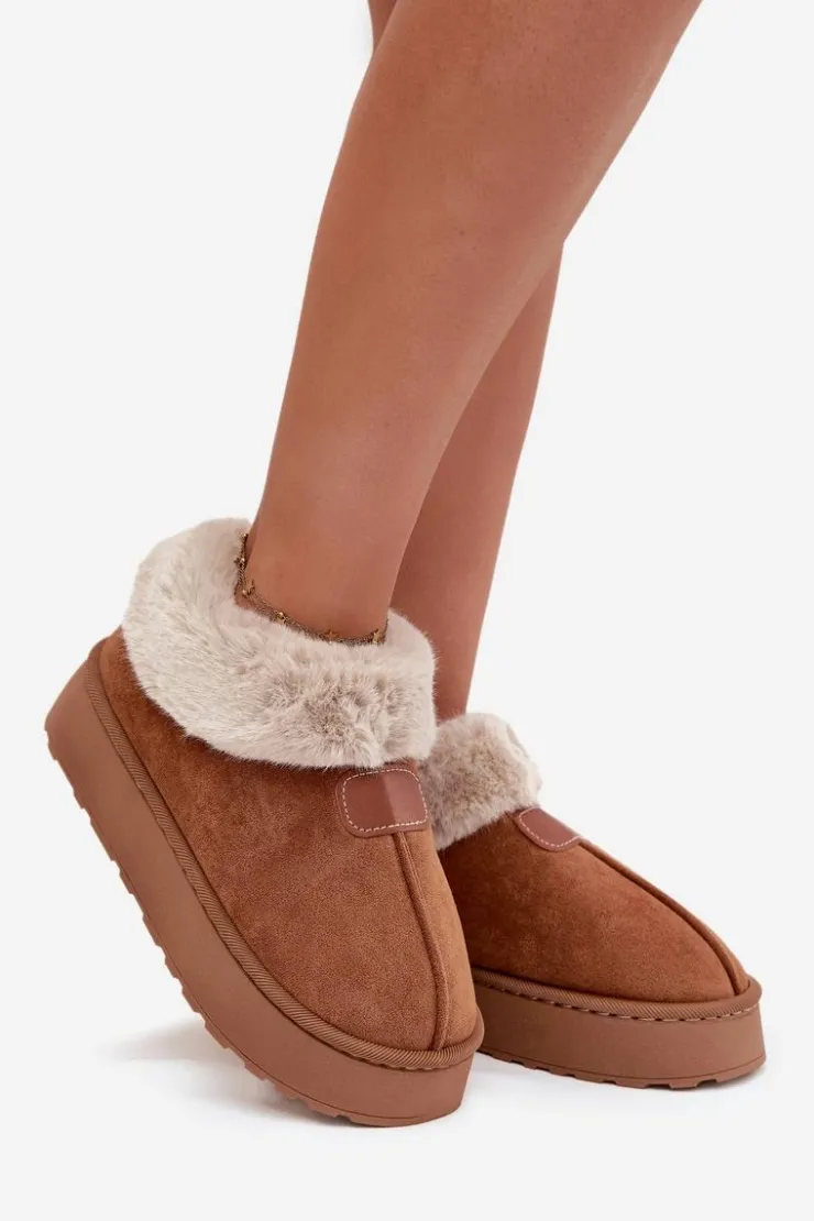 Śniegowce damskie z eko zamszu to wygodne i stylowe obuwie na chłodniejsze dni. Osadzone na praktycznej platformie skutecznie izolują od podłoża, a miękkie futerko zdobiące górę oraz wnętrze buta zapewnia ciepło i przyjemny komfort noszenia. To uniwersalny model, który doskonale sprawdzi się zarówno w domu, jak i podczas szybkich, codziennych wyjść.