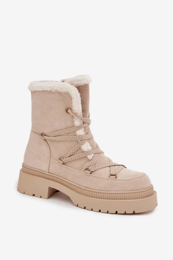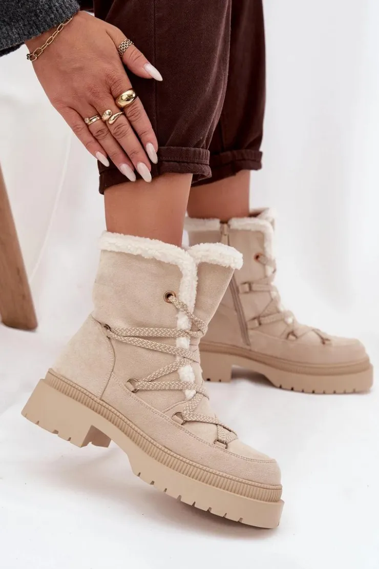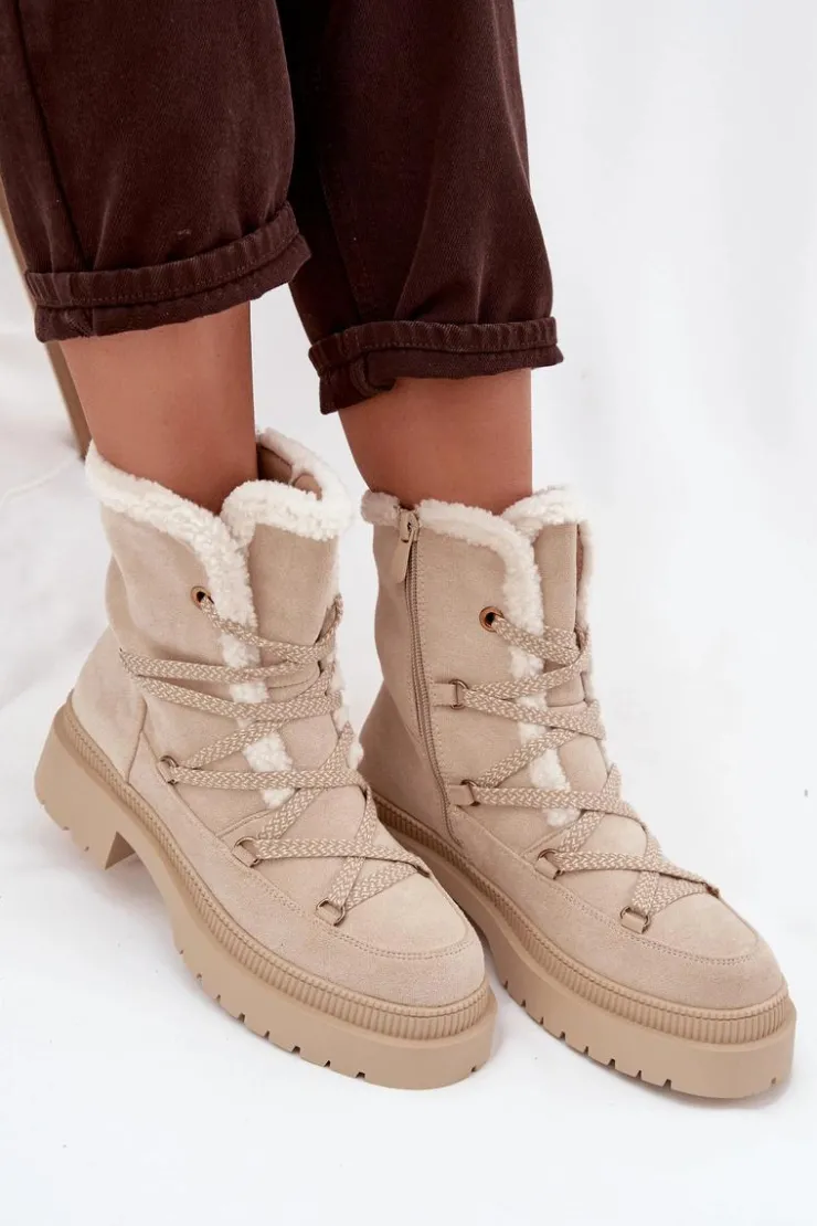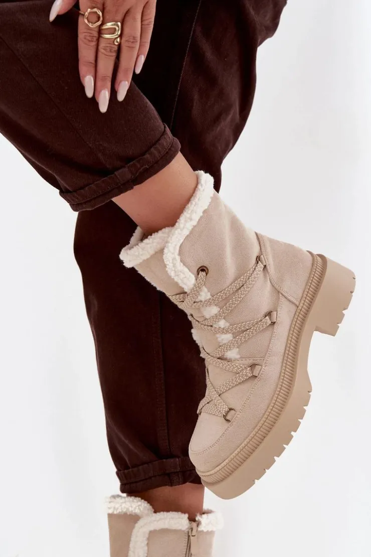 Damskie śniegowce wykonane z eko zamszu to idealna propozycja na zimowe dni. Model zapinany na zamek z dodatkowym wiązaniem zapewnia doskonałe dopasowanie oraz wygodę podczas noszenia. Wnętrze butów zostało ocieplone kocem obuwniczym, który gwarantuje ciepło nawet w mroźne dni. Górną część cholewki ozdobiono miękkim, syntetycznym kożuszkiem, dodającym całości przytulnego i stylowego akcentu. To praktyczne, a zarazem modne śniegowce, które świetnie sprawdzą się zarówno na zimowych spacerach, jak i w codziennych stylizacjach. Przy wyborze rozmiaru prosimy sugerować się tabelą rozmiarów.