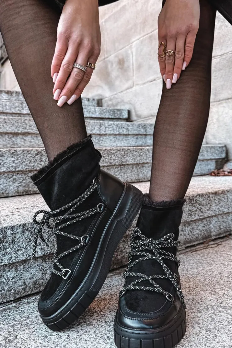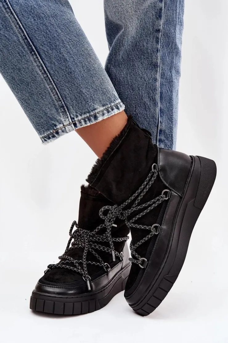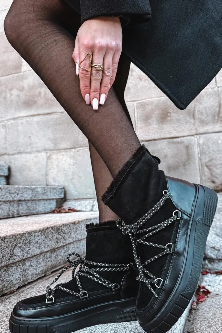 Śniegowce damskie wykonane z połączenia eko zamszu i eko skóry. Model osadzony na platformie zapewnia stabilność i doskonałą izolację od podłoża, a miękkie futerko wewnątrz gwarantuje ciepło i komfort nawet w mroźną pogodę. ,Buty są wsuwane, co ułatwia zakładanie, a wiązanie z przodu pozwala lepiej dopasować je do stopy i stanowi modny element ozdobny. Te śniegowce świetnie sprawdzą się podczas codziennych zimowych stylizacji, łącząc funkcjonalność z modnym, miejskim stylem. Przy wyborze rozmiaru prosimy sugerować się tabelą rozmiarów.