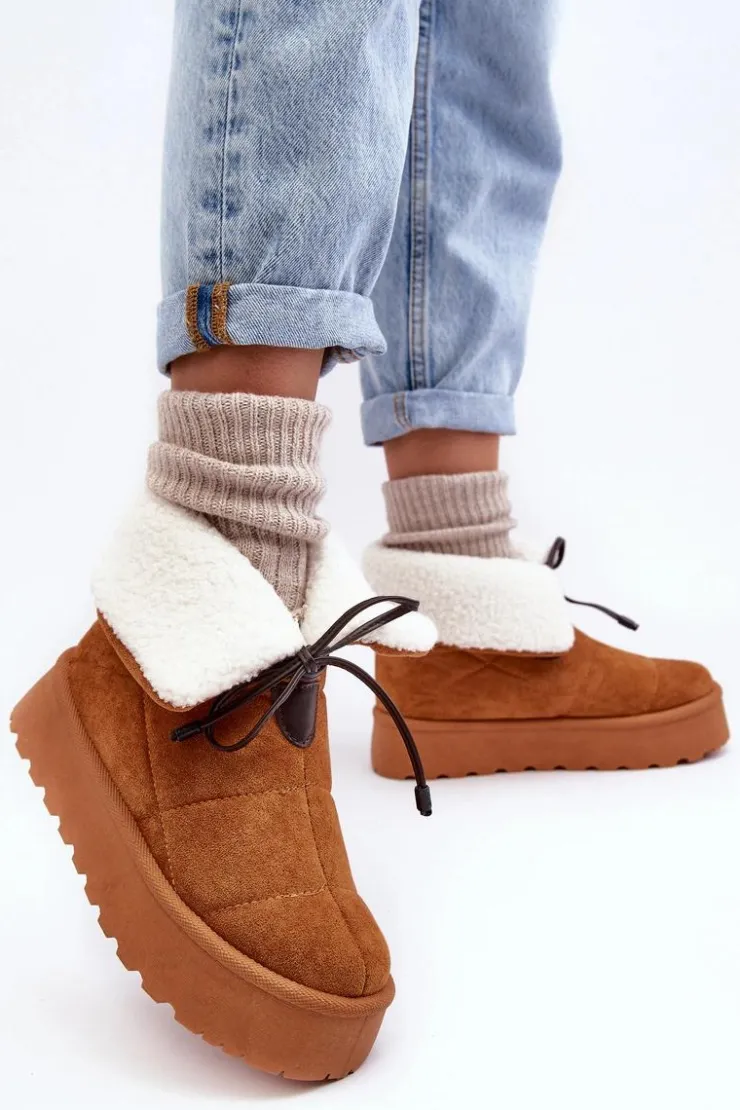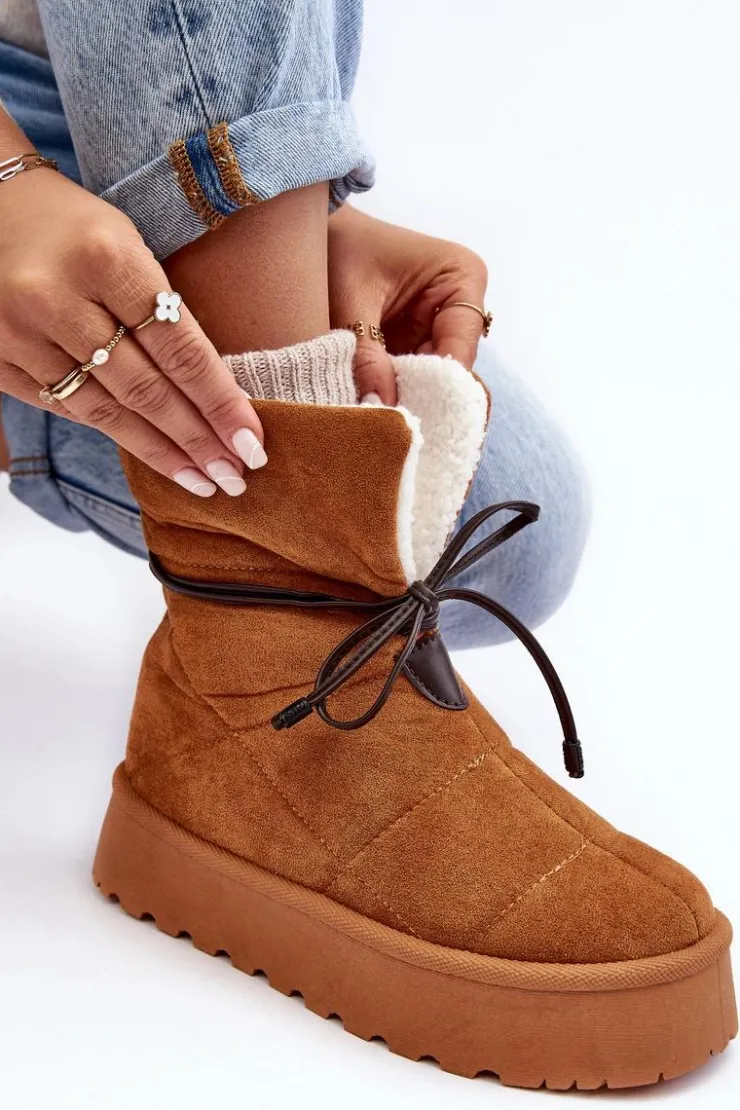 Damskie śniegowce idealnie sprawdzą się podczas mroźnych dni. Wykonane z eko zamszu. Osadzone na grubej platformie. Ocieplone kożuchem. Model wsuwany. Cholewka ozdobiona wiązaniem. Przy wyborze rozmiaru prosimy sugerować się tabelą rozmiarów.