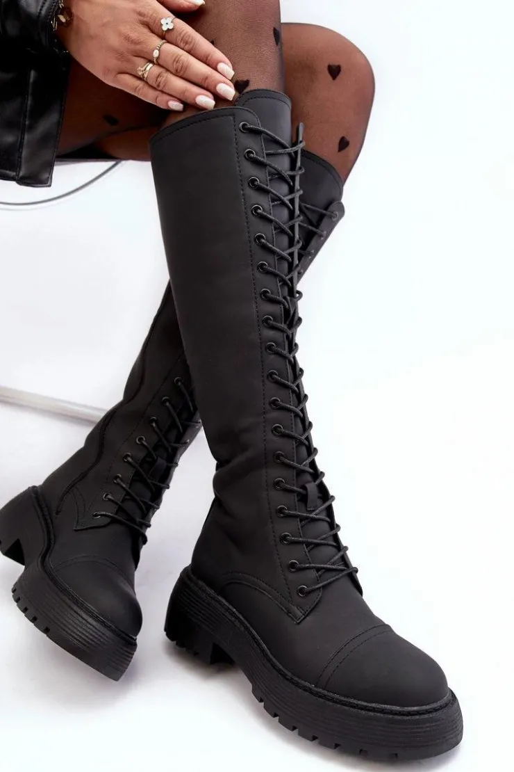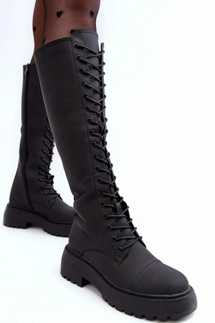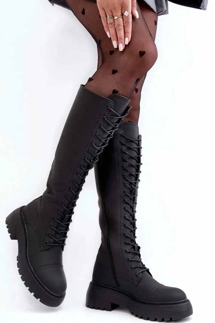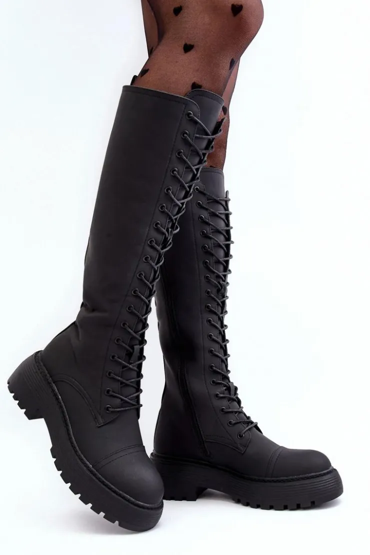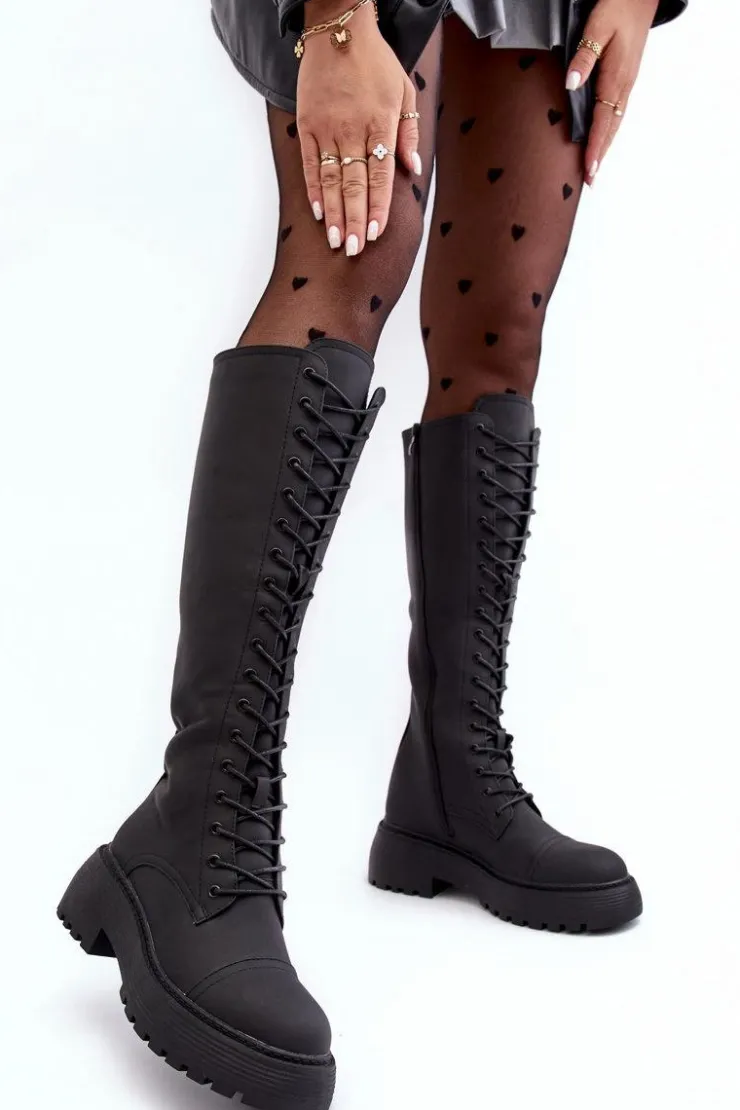Damskie kozaki — glany posiadają sznurowanie oraz suwak na całości cholewki. Wykonane z eko skóry. Cholewka przed kolano. Środek ocieplony kocem obuwniczym. Model ten osadzony jest na płaskim obcasie i platformie. Przy wyborze rozmiaru prosimy kierować tabelą rozmiarów.