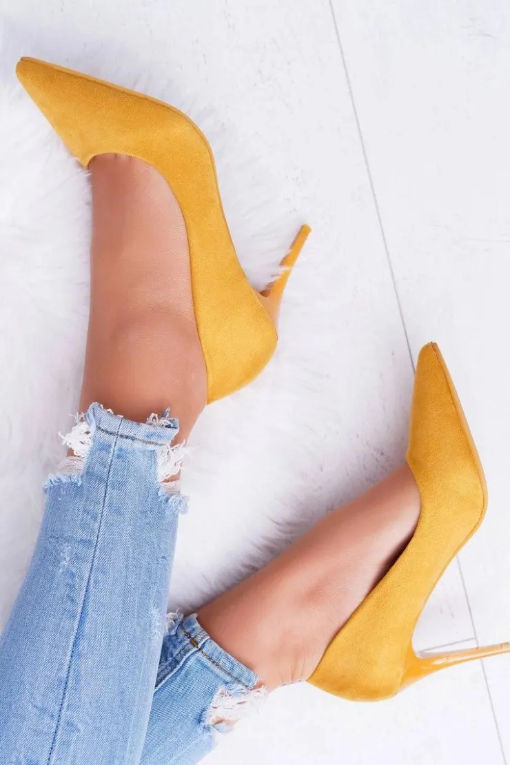 Damskie Boto Szpilki Damskie Zamszowe W Szpic Żółte Cream