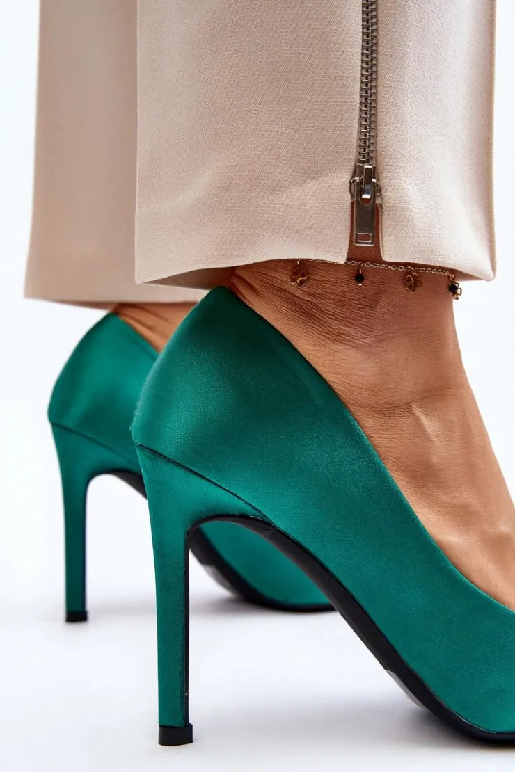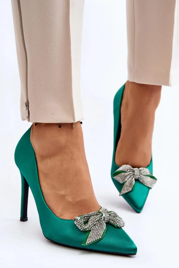 Eleganckie szpilki zostały wykonane z materiału tekstylnego imitującego satynę. Na przodzie znajduje się ozdobna kokarda z mieniącymi się dżetami. Noski w szpic optycznie wysmuklą nogi. Miękka wkładka z eko skóry zapewni wygodę podczas użytkowania. Ten model doda uroku Twoim stylizacjom! Przy wyborze rozmiaru prosimy sugerować się tabelą rozmiarów.
