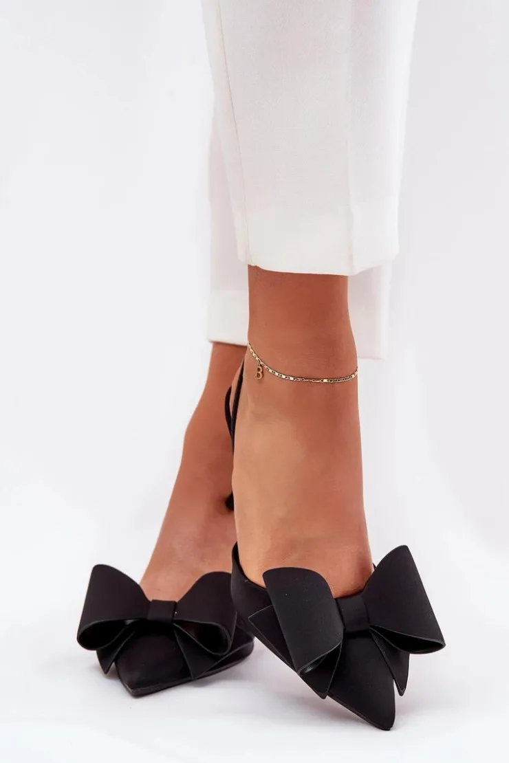 Eleganckie szpilki damskie z odkrytą piętą stanowią doskonały wybór dla kobiet, które pragną połączyć styl z komfortem. Wykonane z materiału tekstylnego. Szpiczaste noski podkreślają ich delikatną elegancję, a kokardka umieszczona z przodu dodaje im dodatkowego wdzięku. Świetnie sprawdzą się na różnorodne okazje, od oficjalnych spotkań po wieczorne wyjścia. Przy wyborze rozmiaru prosimy sugerować się tabelą rozmiarów.