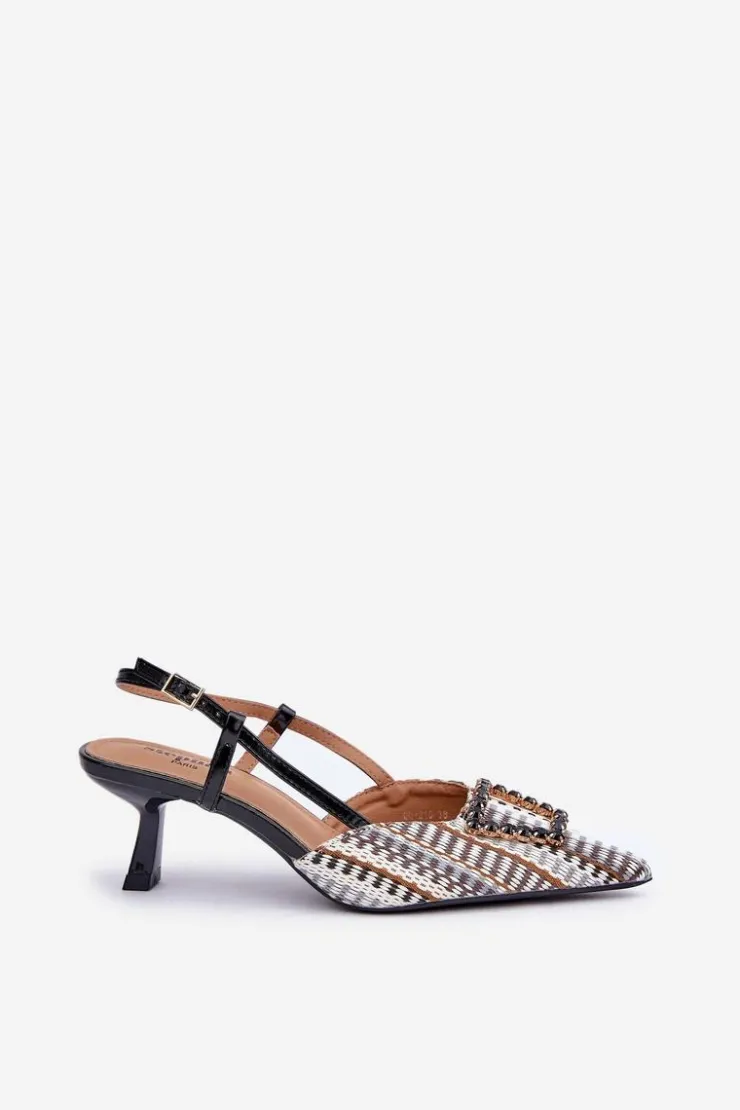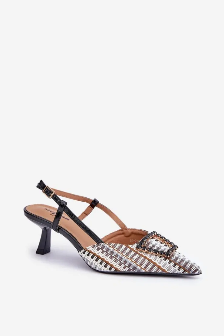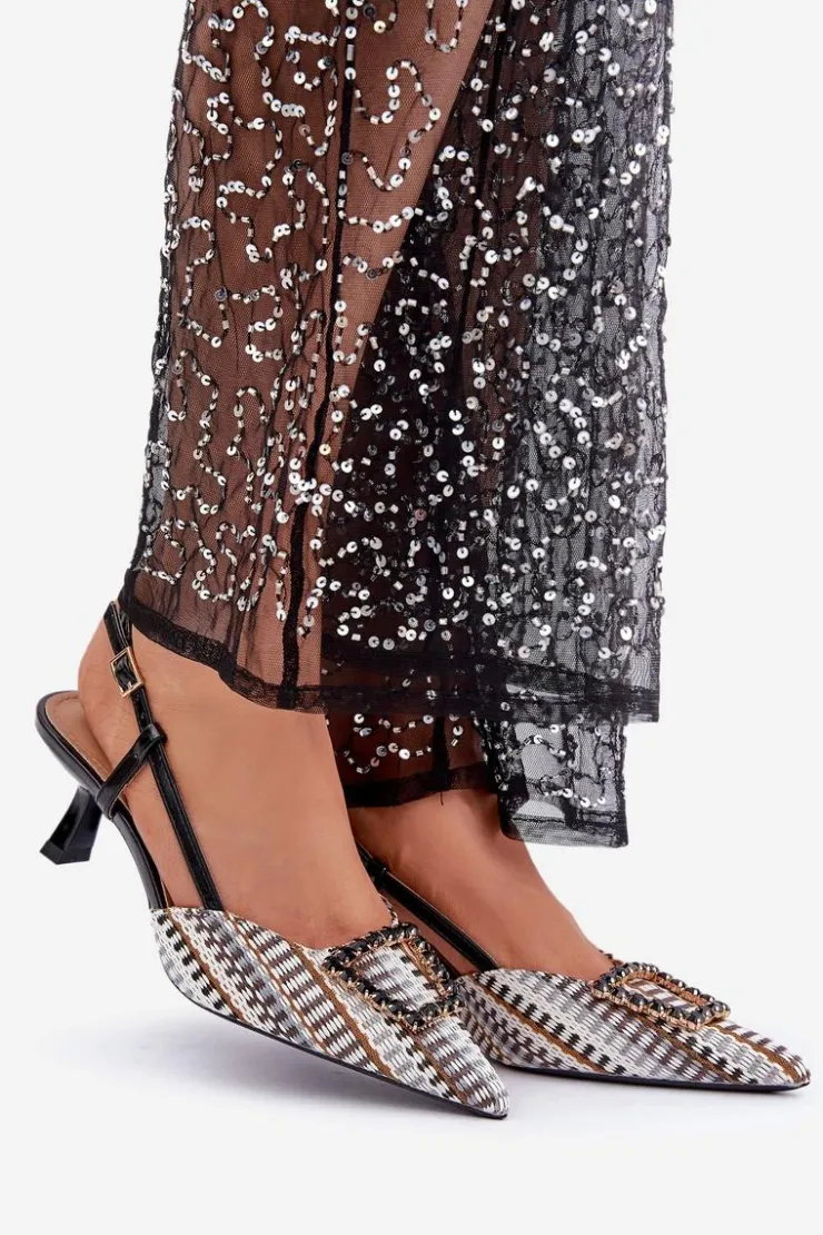 Szpilki damskie z odkrytą piętą, które zachwycają swoim wyglądem. Model z noskami w szpic optycznie wydłuża nogi, a ozdoba z przodu dodaje im wyjątkowego uroku. Zapinane na regulowany pasek ze sprzączką, zapewniają wygodę i doskonałe dopasowanie. Idealny wybór na wieczorne wyjścia i wyjątkowe okazje. Przy wyborze rozmiaru prosimy sugerować się tabelą rozmiarów.
