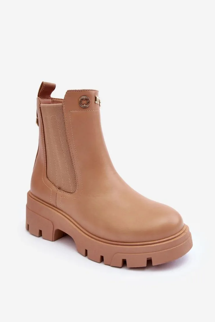 Klasyczne damskie botki osadzone na masywnym, płaskim obcasie oraz platformie. Wykonane z eko skóry. Wnętrze ocieplone kocem obuwniczym. Model zapinany na suwak. Na górze cholewki małe, złote ozdoby z tworzywa sztucznego. Koniecznie powinnaś mieć ten model w swojej szafie! Przy wyborze rozmiaru prosimy sugerować się tabelą rozmiarów.