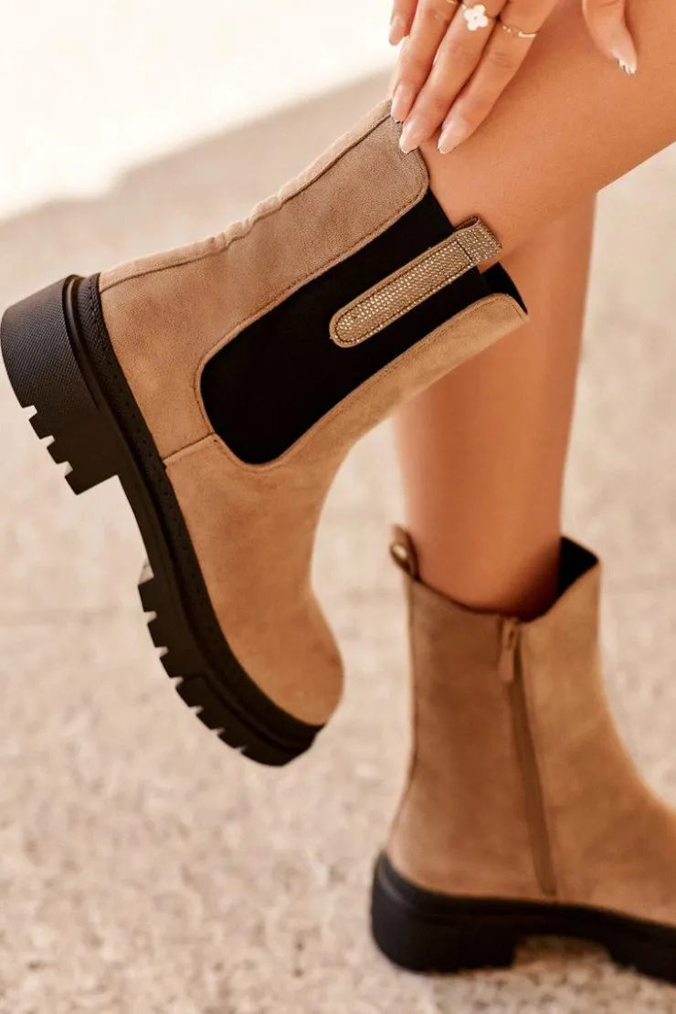 Damskie sztyblety osadzone na płaskim, stabilnym obcasie oraz platformie. Model ten wykonany jest z eko zamszu. Zapinany na suwak po wewnętrznej stronie cholewki. Na elastycznej wstawce znajduje się zdobienie w postaci małych, błyszczących dżetów. Zapiętek jest usztywniony, wnętrze ocieplone kocem obuwniczym. Przy wyborze rozmiaru prosimy sugerować się tabelą rozmiarów.