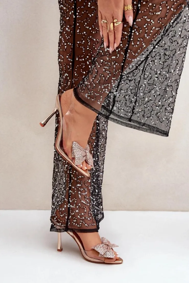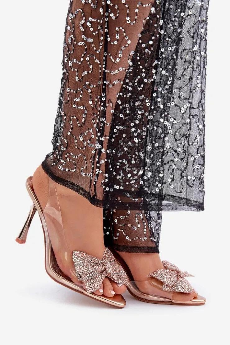 Eleganckie transparentne sandały na szpilce, które idealnie podkreślą wyjątkowy charakter Twojej stylizacji. Model wyróżnia się efektowną, błyszczącą kokardą z przodu, dodającą odrobinę glamour. Model ten doskonale komponują się z sukniami koktajlowymi oraz eleganckimi kompletami, tworząc szykowny i modny look. Przy wyborze rozmiaru prosimy sugerować się tabelą rozmiarów.