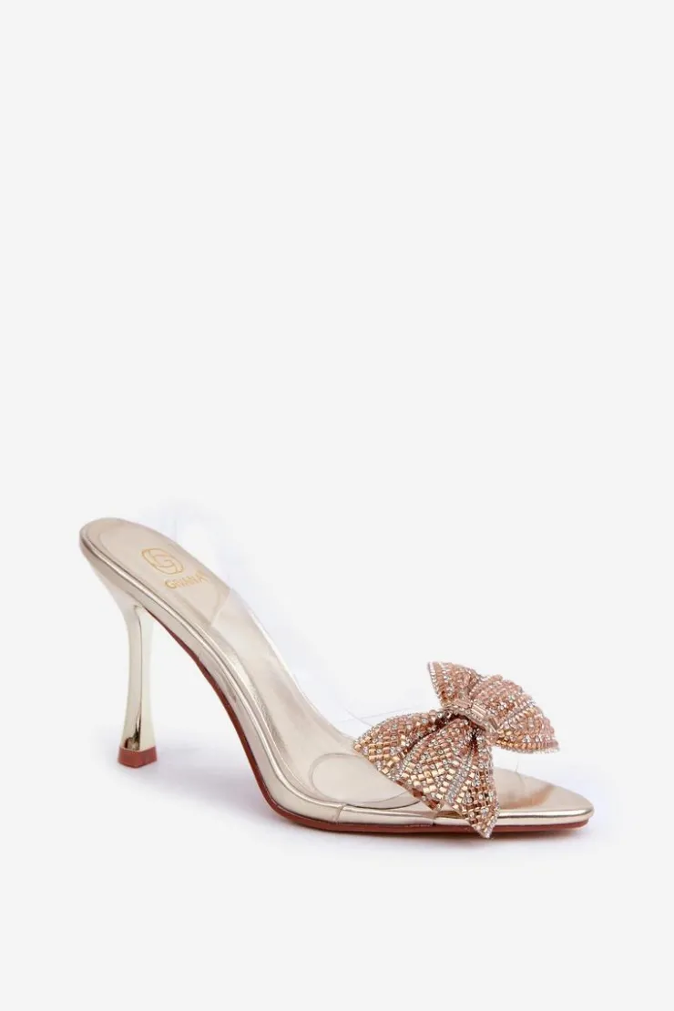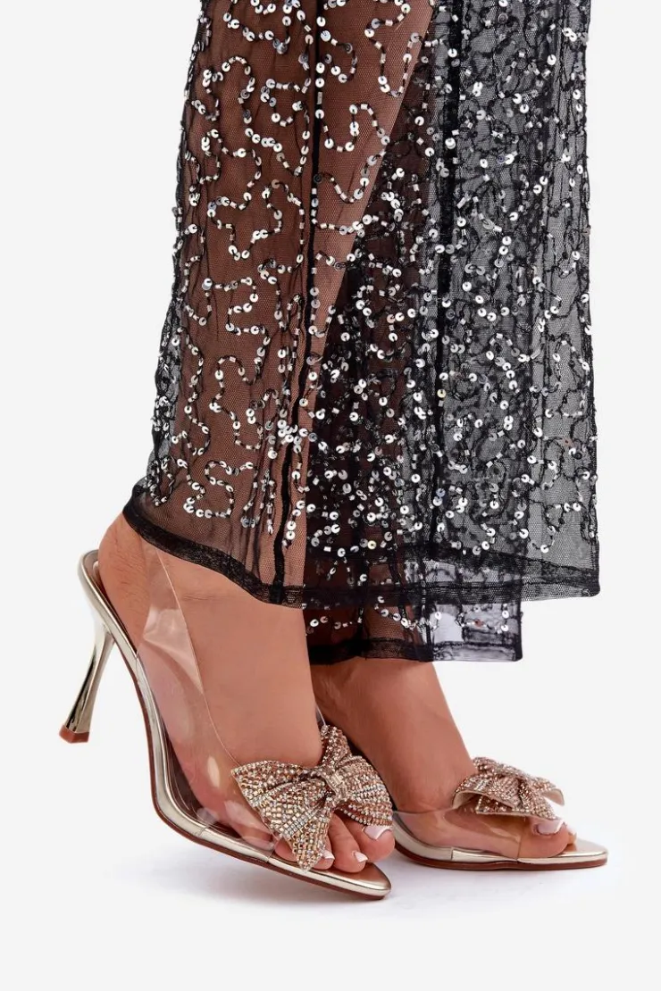 Eleganckie transparentne sandały na szpilce, które idealnie podkreślą wyjątkowy charakter Twojej stylizacji. Model wyróżnia się efektowną, błyszczącą kokardą z przodu, dodającą odrobinę glamour. Model ten doskonale komponują się z sukniami koktajlowymi oraz eleganckimi kompletami, tworząc szykowny i modny look. Przy wyborze rozmiaru prosimy sugerować się tabelą rozmiarów.