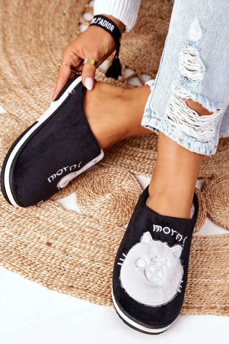 Damskie Boto Welurowe Papcie Z Kotem Czarne Good Morning