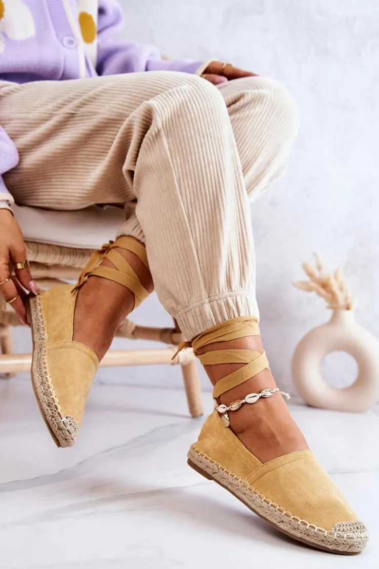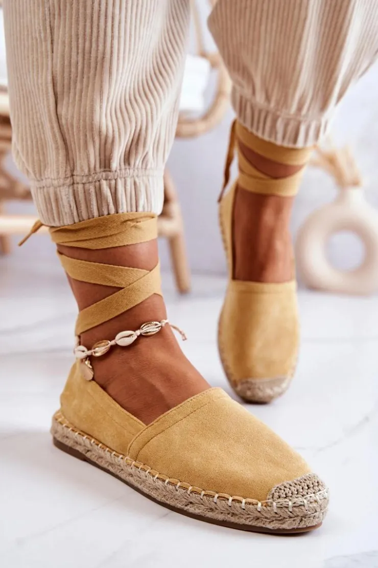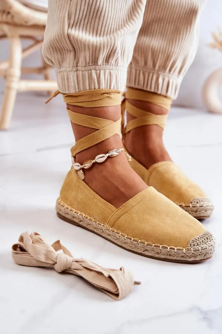 Klasyczne espadryle na płaskiej podeszwie. Wkładka wykonana z eko skóry. Ciekawy model, który powinnaś mieć w swojej garderobie! Eko zamszowe espadryle są wiązane wokół nogi. Materiałowy pasek jest wyciągany. Podeszwa antypoślizgowa oraz pleciona. Koniecznie sprawdź także pozostałą naszą kolekcję damskich espadryli.