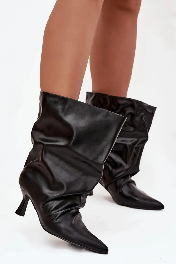 Botki damskie wykonane z eko skóry to stylowy model, który łączy elegancję z modnym akcentem. Osadzone na smukłej szpilce, pięknie podkreślają sylwetkę i dodają kobiecego wdzięku. Wsuwany fason zapewnia wygodę zakładania, a szeroka, marszczona cholewka nadaje im wyjątkowego, nowoczesnego charakteru. To efektowne botki, które doskonale uzupełnią zarówno codzienne, jak i wieczorowe stylizacje. Przy wyborze rozmiaru prosimy sugerować się tabelą rozmiarów.