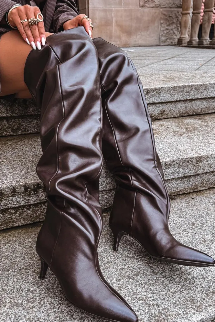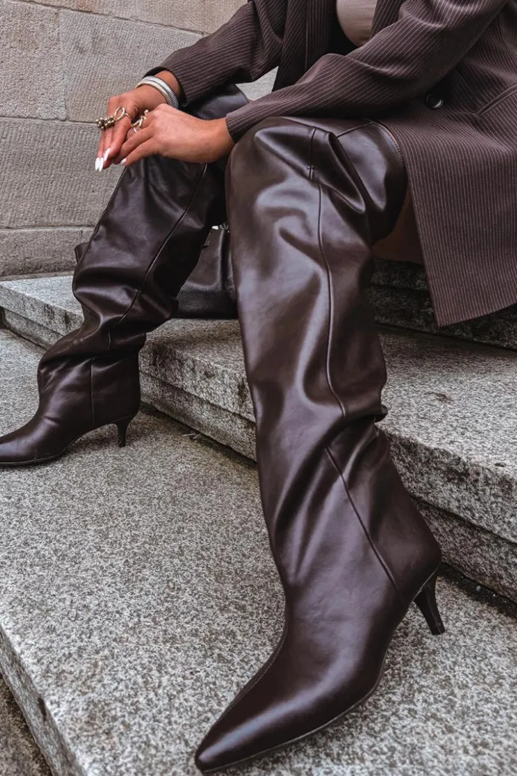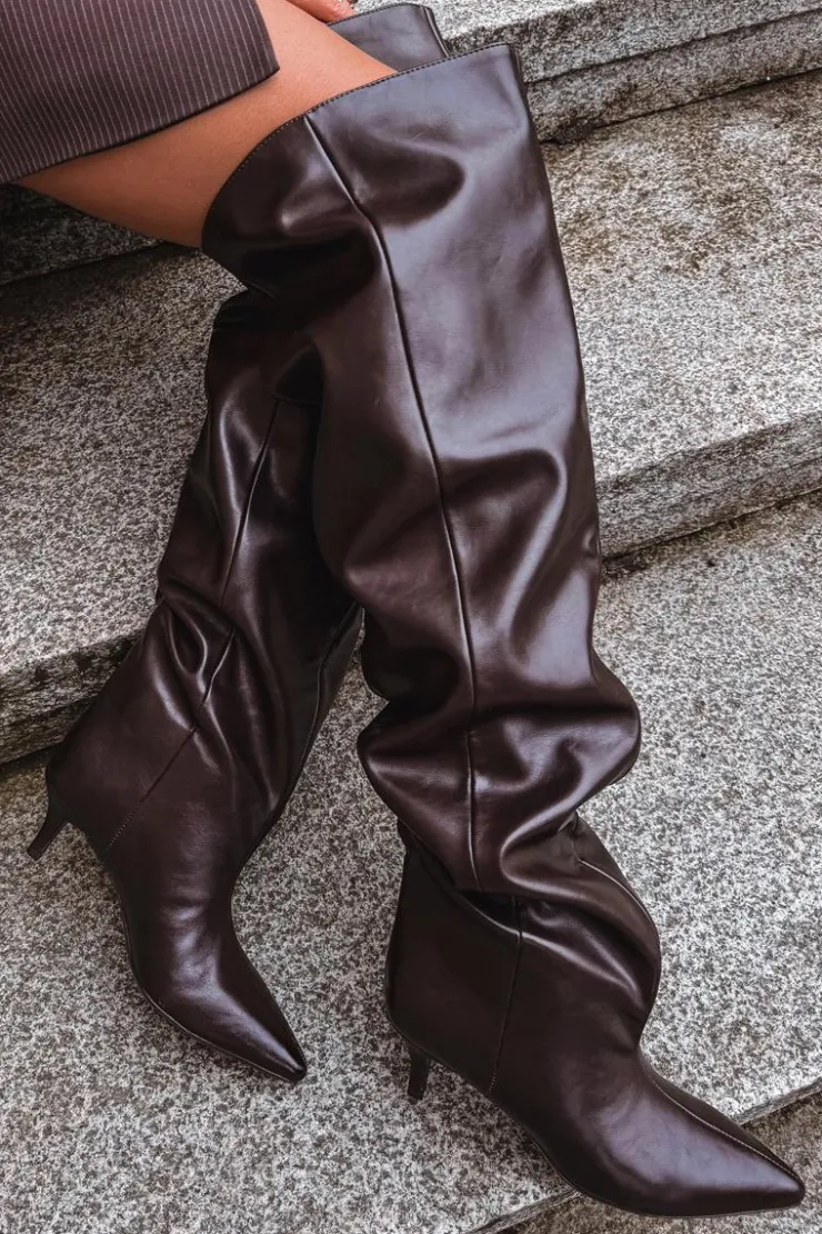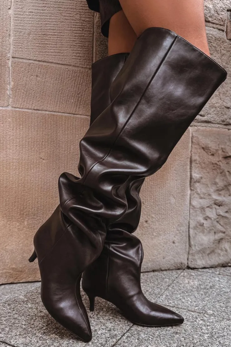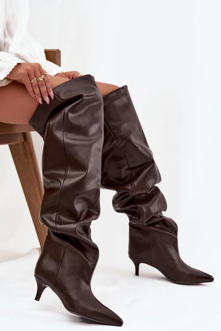 Kozaki damskie wykonane z eko skóry. Model został osadzony na niskiej szpilce. Charakterystyczną cechą butów jest szeroka cholewka, która nie tylko nadaje im modnego wyglądu, ale również sprawia, że kozaki są wygodne w noszeniu i łatwe do dopasowania do każdej nogi. Wsuwany fason ułatwia szybkie zakładanie i zdejmowanie, czyniąc obuwie praktycznym w codziennym użytkowaniu. To kozaki, które doskonale sprawdzą się zarówno w zestawieniach casualowych, jak i bardziej eleganckich stylizacjach, dodając im wyrafinowanego charakteru. Przy wyborze rozmiaru prosimy kierować tabelą rozmiarów.