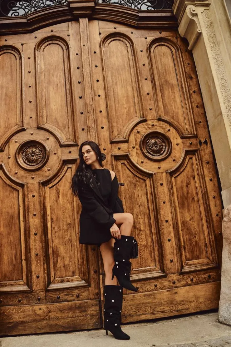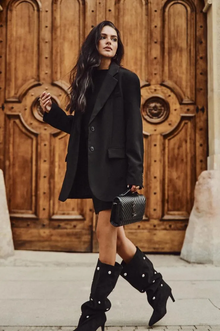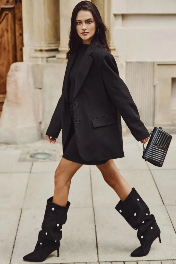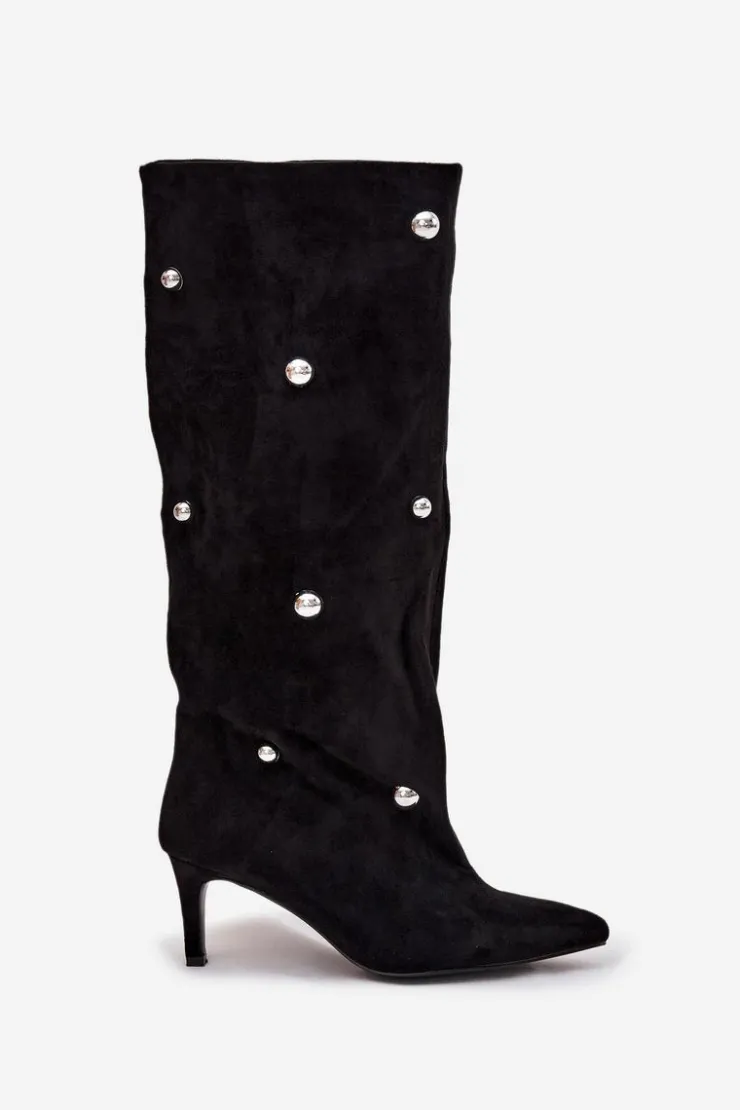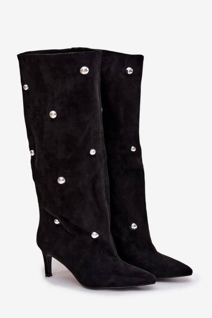 Damskie Boto Wsuwane Kozaki Damskie Na Szpilce Ze Srebrnymi Ozdobami Czarne Thaliane