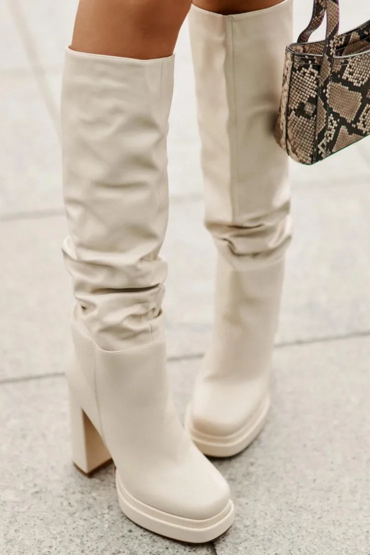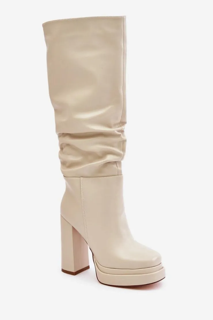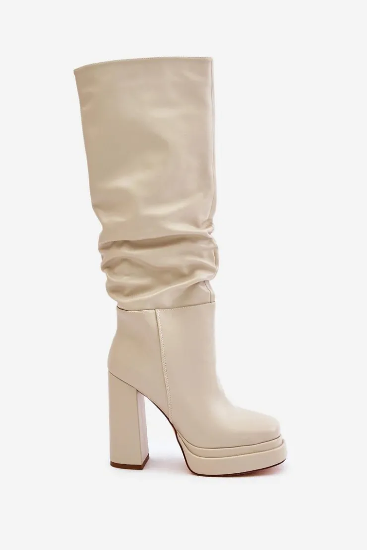 Damskie Boto Wsuwane Kozaki Na Słupku I Platformie Z Marszczeniem Ocieplane Jasnobeżowe Beridra