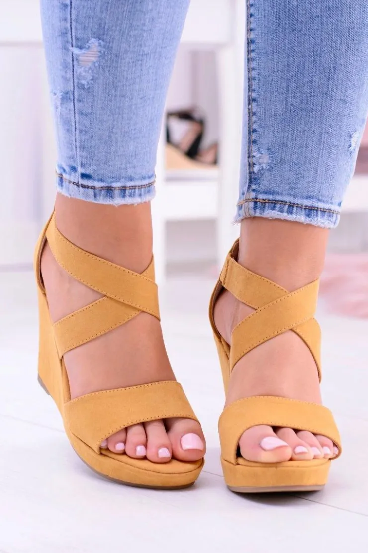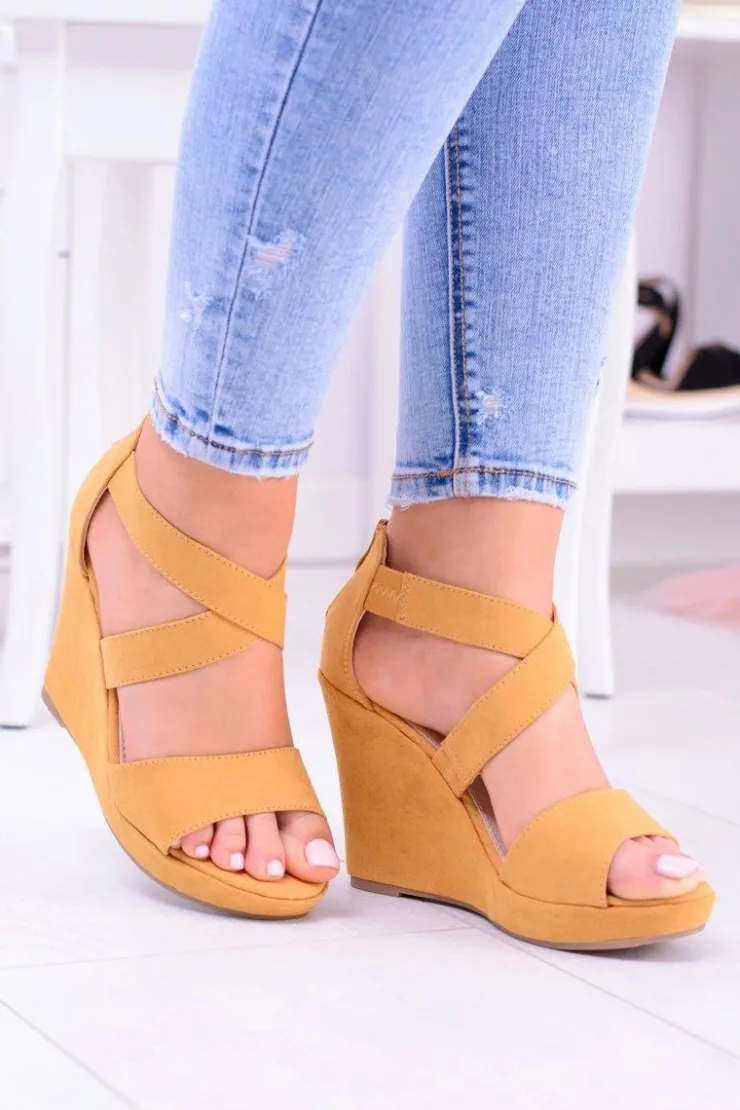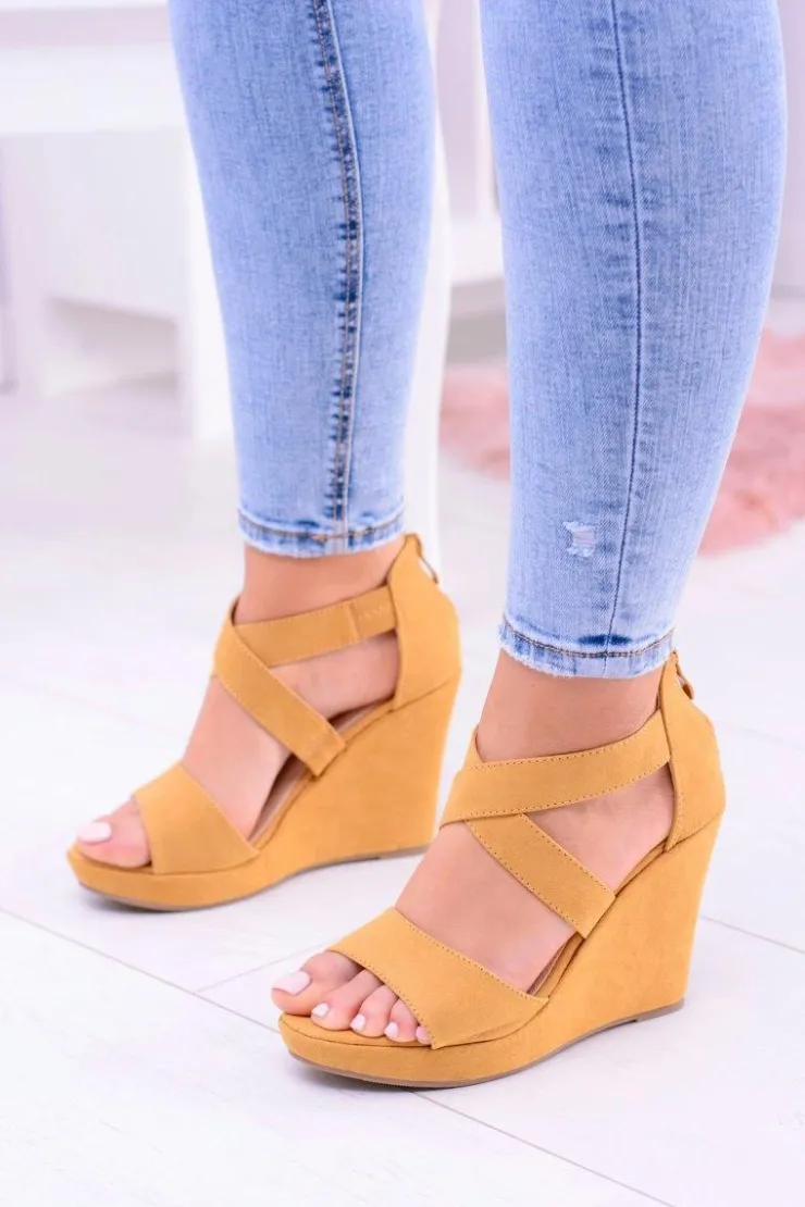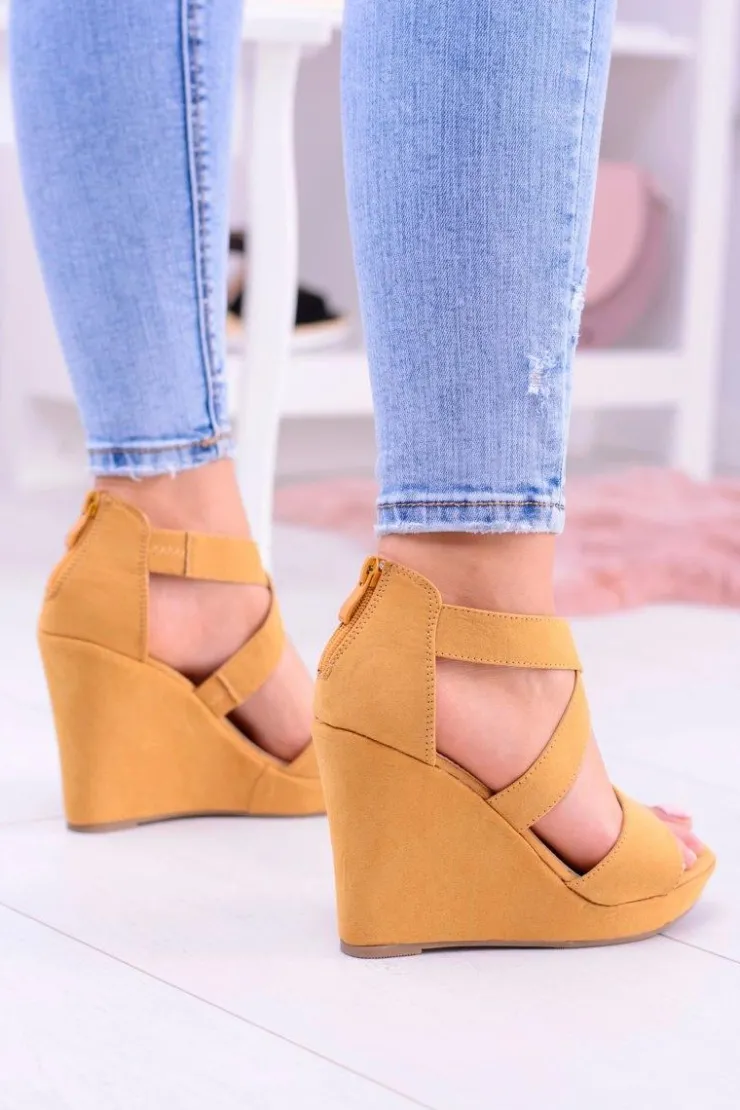 Damskie Boto Wygodne Damskie Żółte Sandały Koturny Mirabet