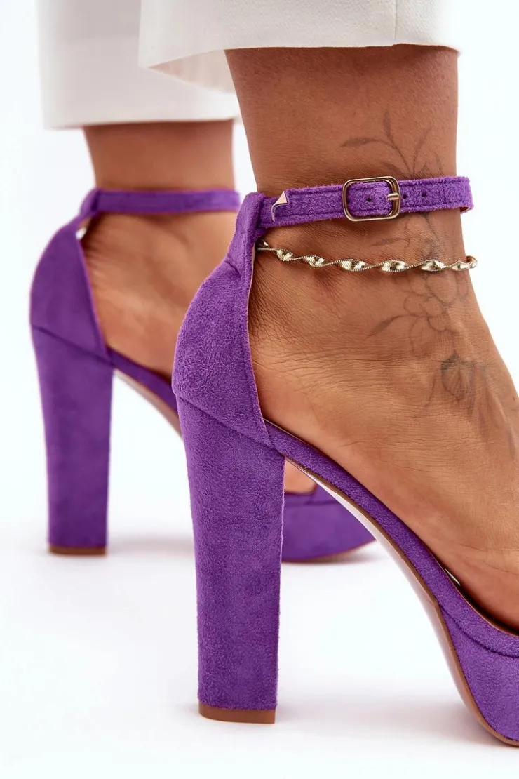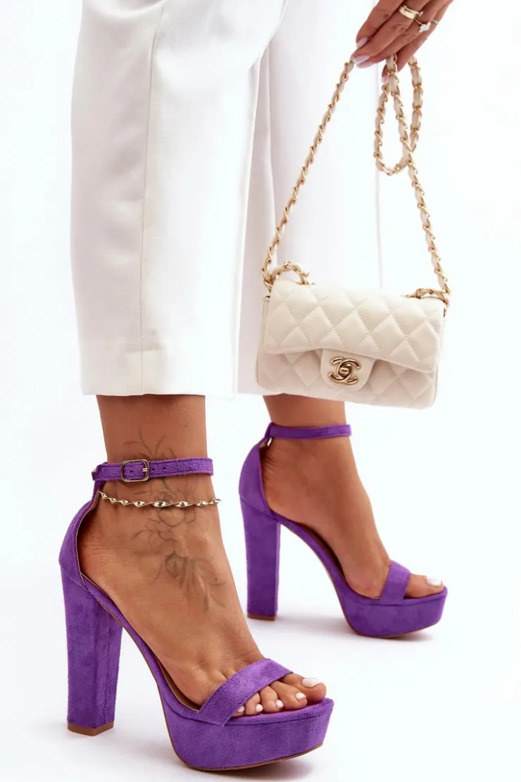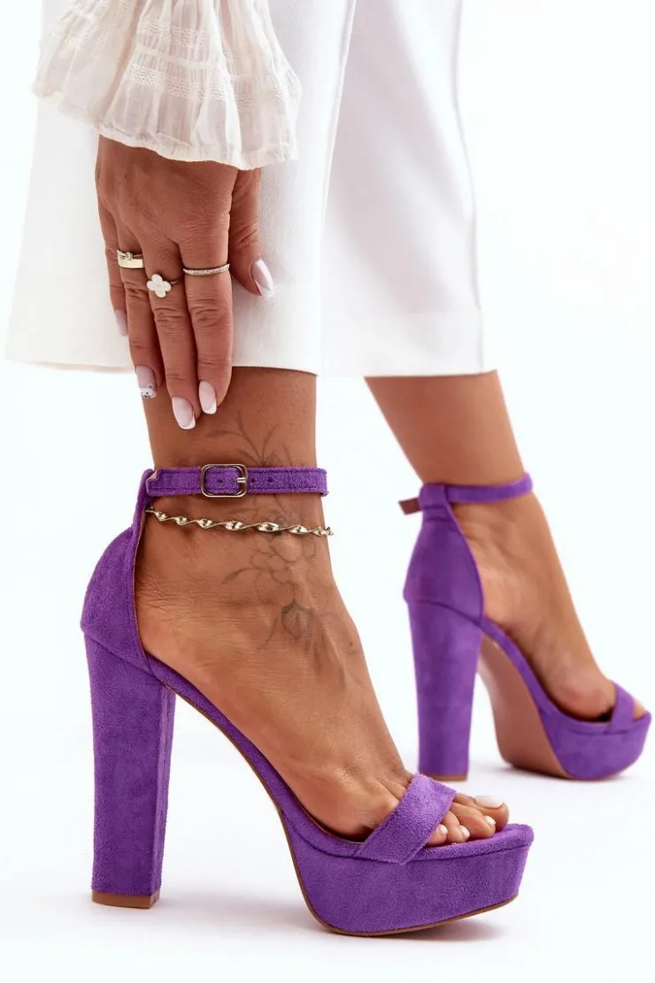 Klasyczne sandałki zostały wykonane z miłego w dotyku eko zamszu. Model ten posiada na przodzie cienki pasek podtrzymujący stopę przed przesuwaniem. Sandałki osadzono na obcasie w postaci wysokiego słupka. Dodatkowo sandałki posiadają delikatnie usztywniany zapiętek. Model ten jest zapinany na regulowany pasek ze sprzączką. Przy wyborze rozmiaru prosimy sugerować się tabelą rozmiarów.