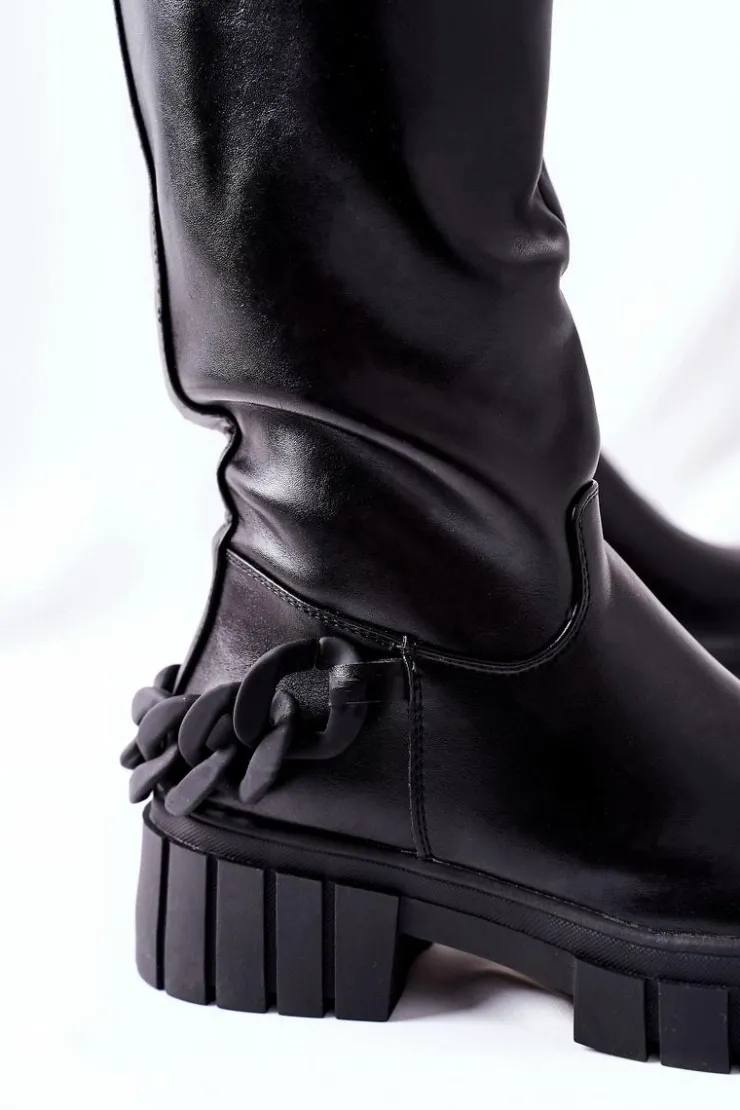 Kozaki do kolana wykonane ze skóry ekologicznej. Wnętrze ocieplane kocem obuwniczym. Posiadają ozdobny łańcuch na pięcie.