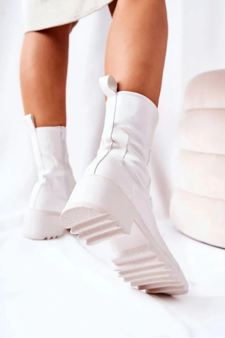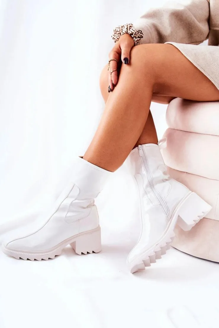 Damskie Boto Wysokie Lakierowane Botki Na Obcasie Białe Merelien