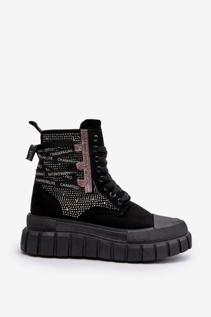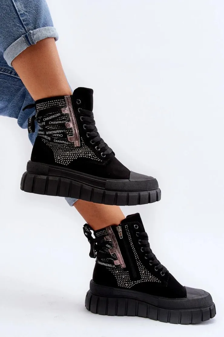 Wysokie trampki damskie wykonane z połączenia eko zamszu i materiału tekstylnego. Ich masywna platforma i podwójne sznurowanie nadają im nowoczesny wygląd, który świetnie komponuje się w różnych stylizacjach. Dodatkowe zapięcie na zamek ułatwi zakładanie obuwia. To absolutny must-have w Twojej garderobie! Przy wyborze rozmiaru prosimy sugerować się tabelą rozmiarów.