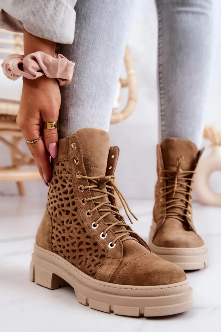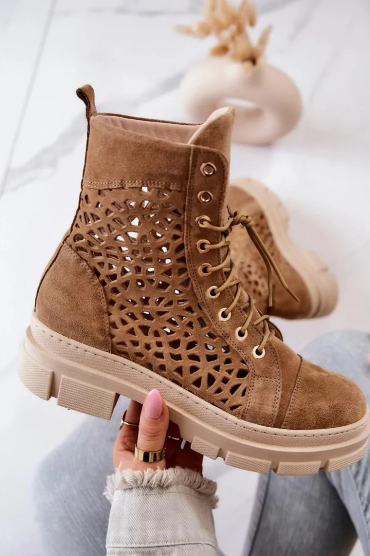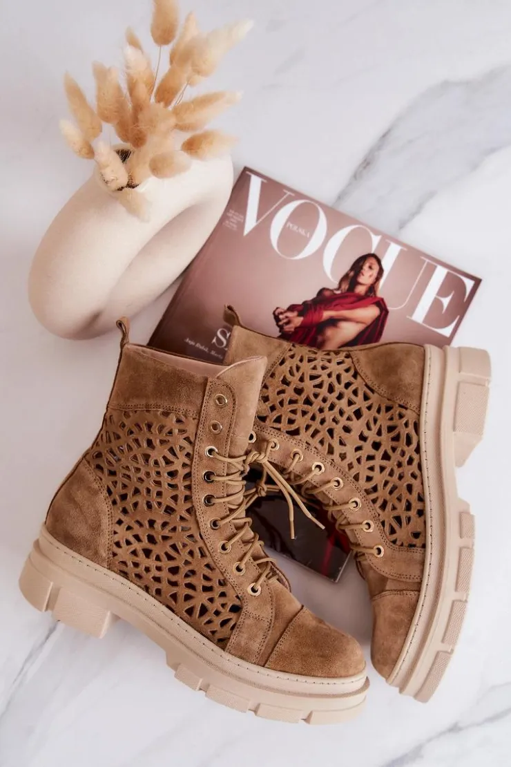Świetne, ażurowe botki zostały wykonane z naturalnej, zamszowej skóry z dbałością o każdy detal. Skórzana wkładka oraz wygodny, płaski obcas zadbają o Twój komfort. Botki dopełnią wiele stylizacji. Posiadają klasyczne wiązanie. Powinnaś uzupełnić swoją garderobę właśnie o ten model botków, dlatego nie czekaj dłużej i kup już teraz ! Przy wyborze rozmiaru prosimy sugerować się tabelą rozmiarów.