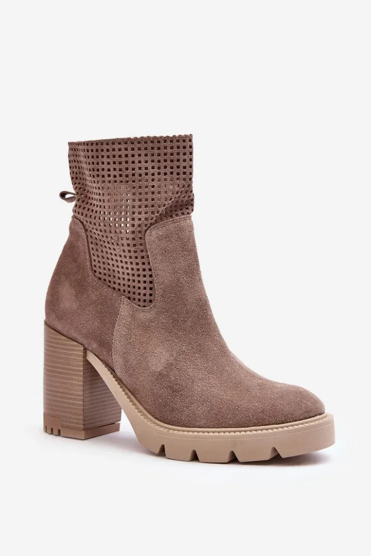 Modne, ażurowe botki na obcasie w postaci słupka zostały wykonane z wysokiej jakości skóry naturalnej. Zapinane na suwak z boku cholewki. Miękka, niezwykle wygodna wkładka została wykonana również z naturalnej skóry. Świetny model do wielu stylizacji! Przy wyborze rozmiaru prosimy sugerować się tabelą rozmiarów.