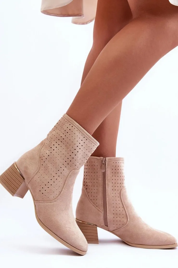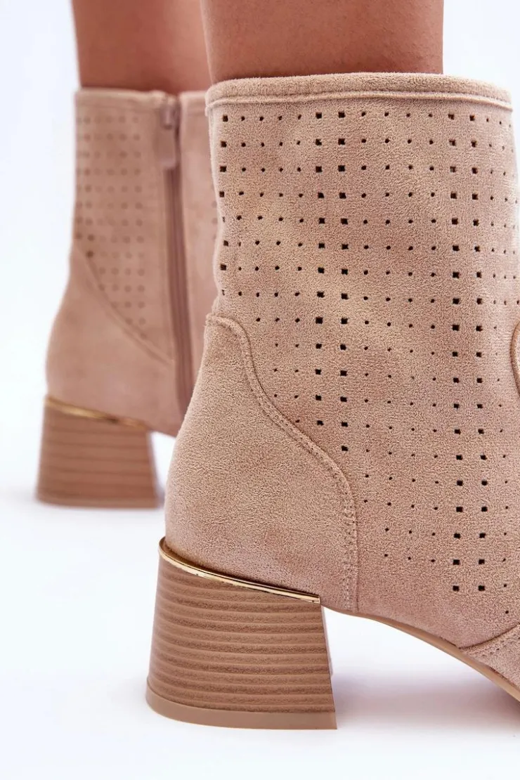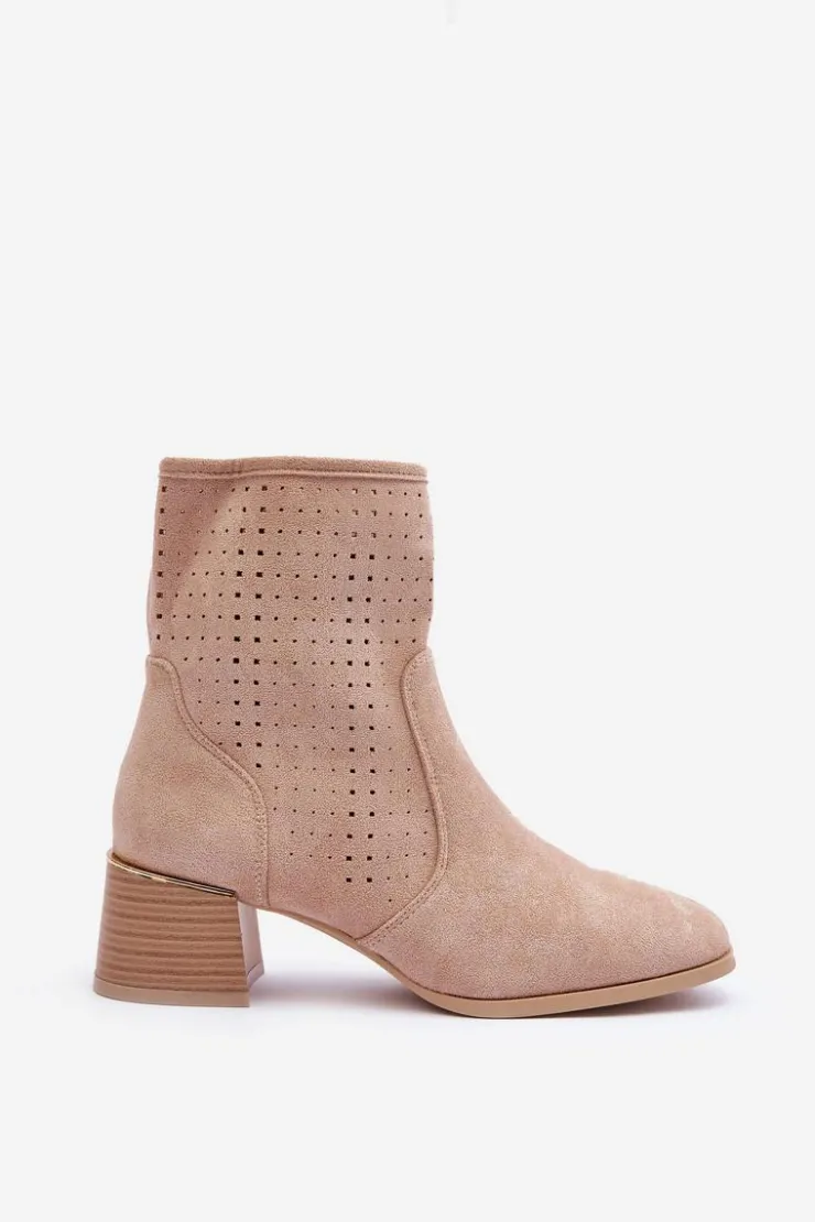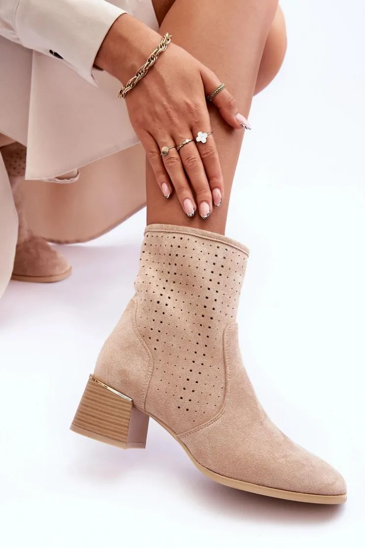 Damskie Boto Zamszowe Ażurowe Botki Na Obcasie Beżowe Perale
