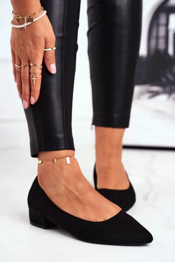 Baleriny na obcasie wykonane z eko zamszu. Nosek w szpic wysmukli Twoją sylwetkę! Przy wyborze rozmiaru prosimy kierować się tabelą rozmiarów