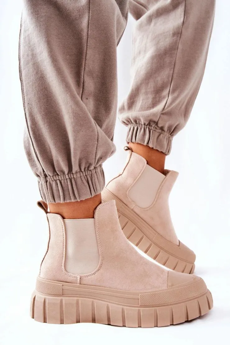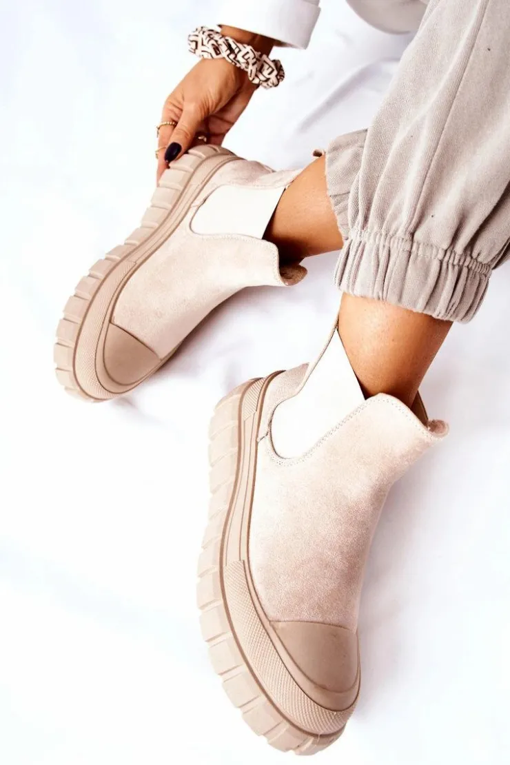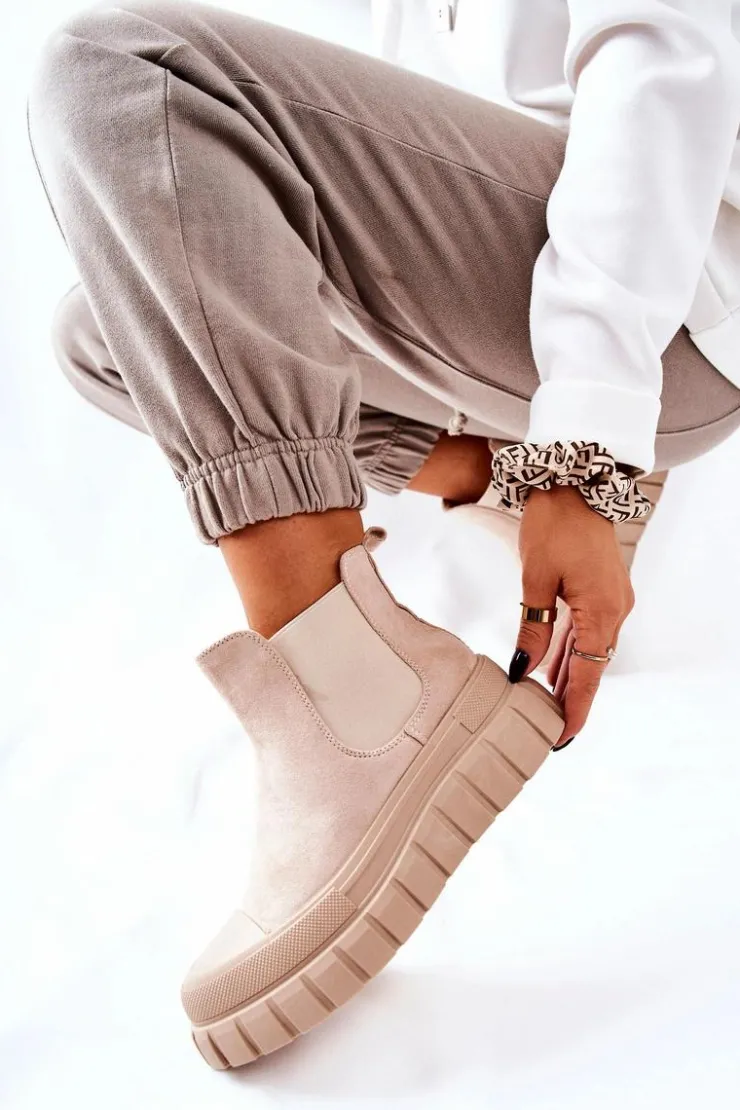 Botki zostały wykonane z eko zamszu. Gumy ściągające na wysokości cholewki zapewnią dopasowanie do nogi oraz wygodę. Wysoka platforma sprawia, że buty są komfortowe w noszeniu. Środek jest ocieplony delikatnym, przyjemnym w dotyku futerkiem. Botki posiadają wzmocnienie na przodzie w postaci gumy. Przy wyborze rozmiaru prosimy sugerować się tabelą rozmiarów.