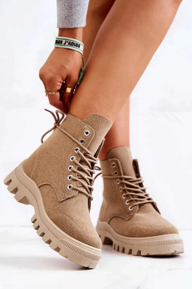 Śliczne trapery zachwycą niejedną miłośniczkę odważnych, modnych, a przede wszystkim wygodnych stylizacji! Wykonane z zamszowej eko skóry na zewnątrz. W środku wygodna wkładka została wykonana z eko skóry. O idealne dopasowanie do nóg zadba solidne sznurowanie. Traperowa podeszwa zadba o stabilność na nierównych nawierzchniach. Przy wyborze rozmiaru prosimy sugerować się tabelą rozmiarów.