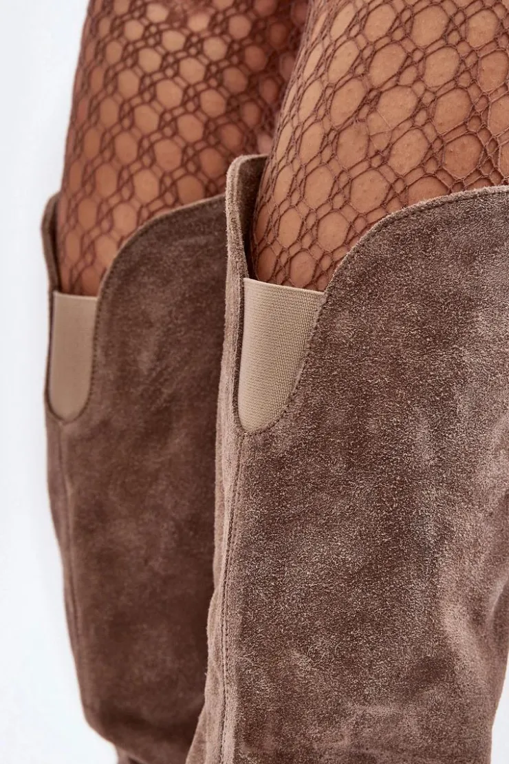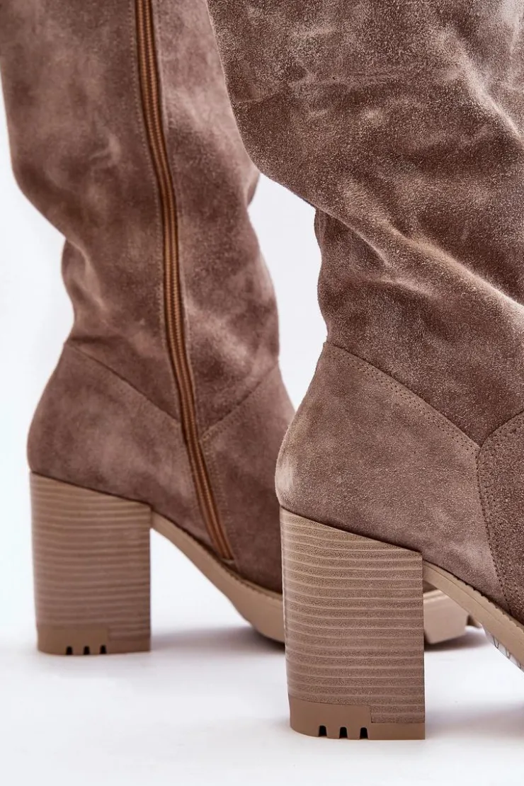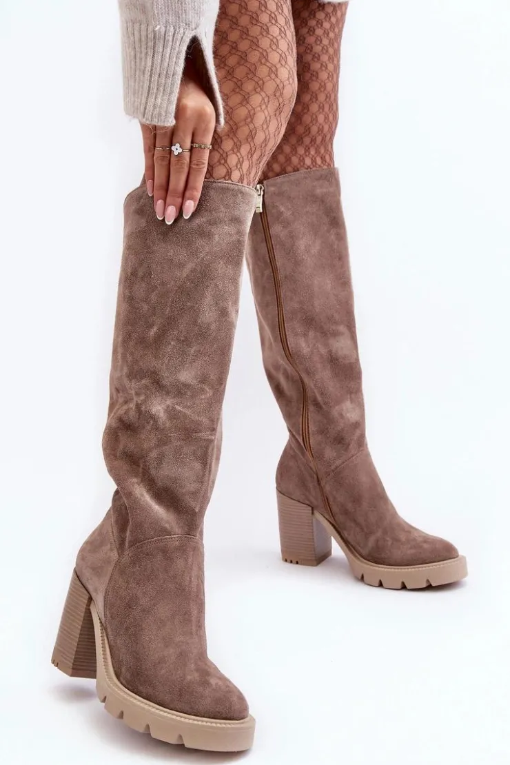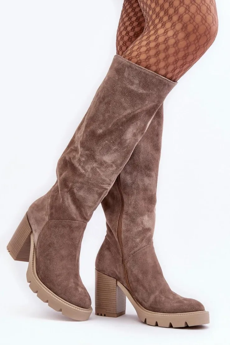 Kozaki damskie wykonane z wysokiej jakości skóry naturalnej. Cholewka do kolana. Osadzone na platformie oraz masywnym obcasie w postaci słupka. Model ten zapinany jest na suwak. Nie posiadają ocieplenia. Noski zaokrąglone. Zapiętek jest usztywniony. Ten klasyczny fason świetnie sprawdzi się w wielu stylizacjach! Przy wyborze rozmiaru prosimy sugerować się tabelą rozmiarów.