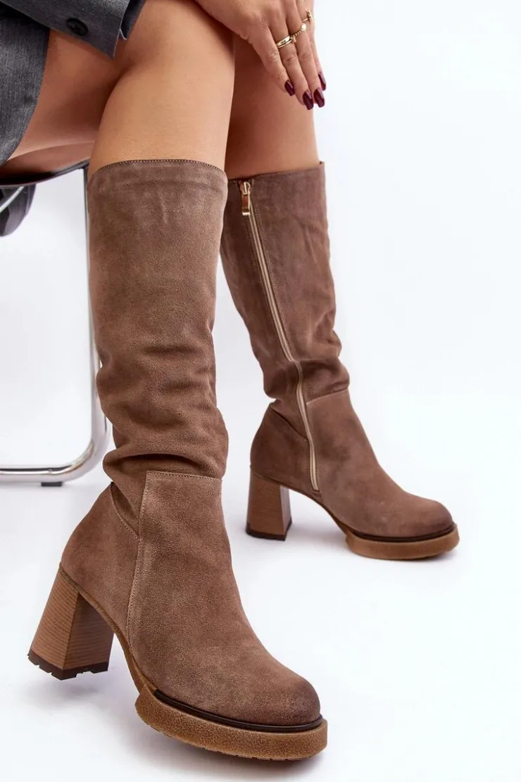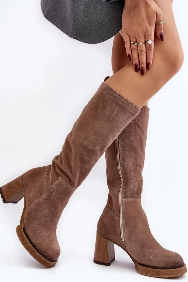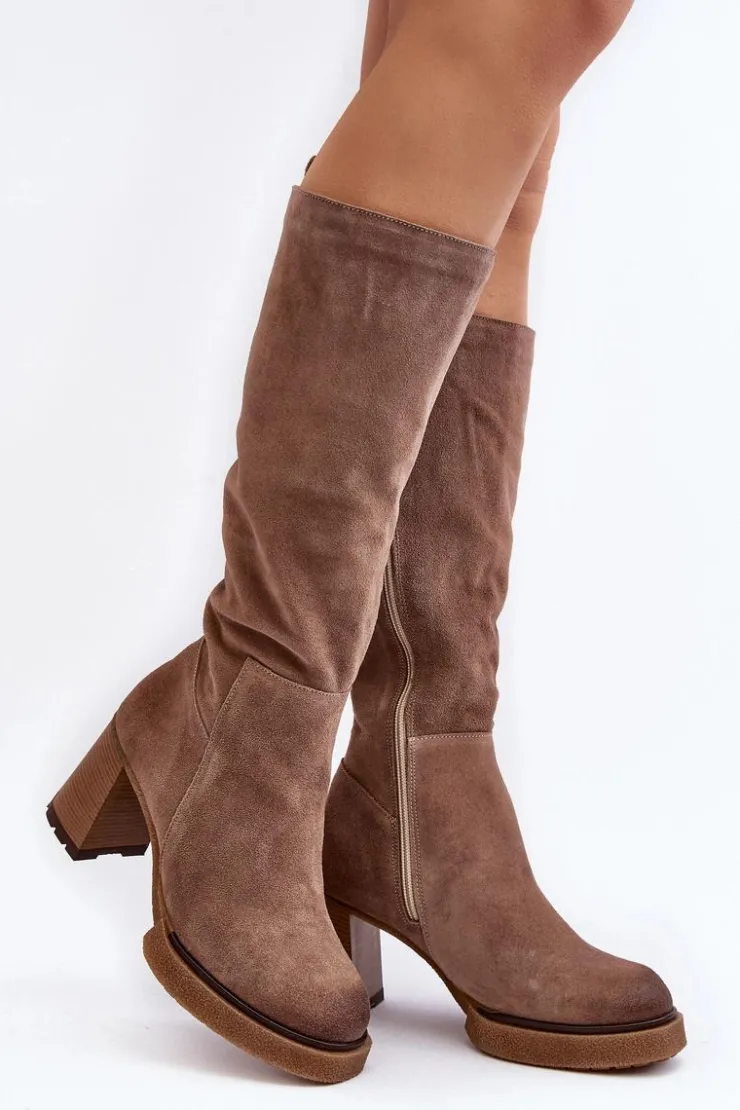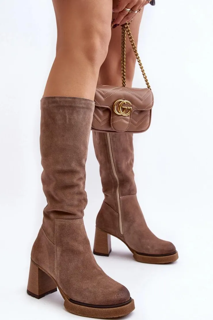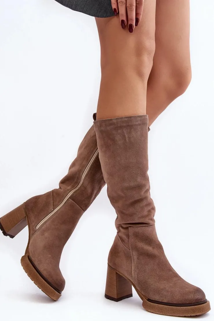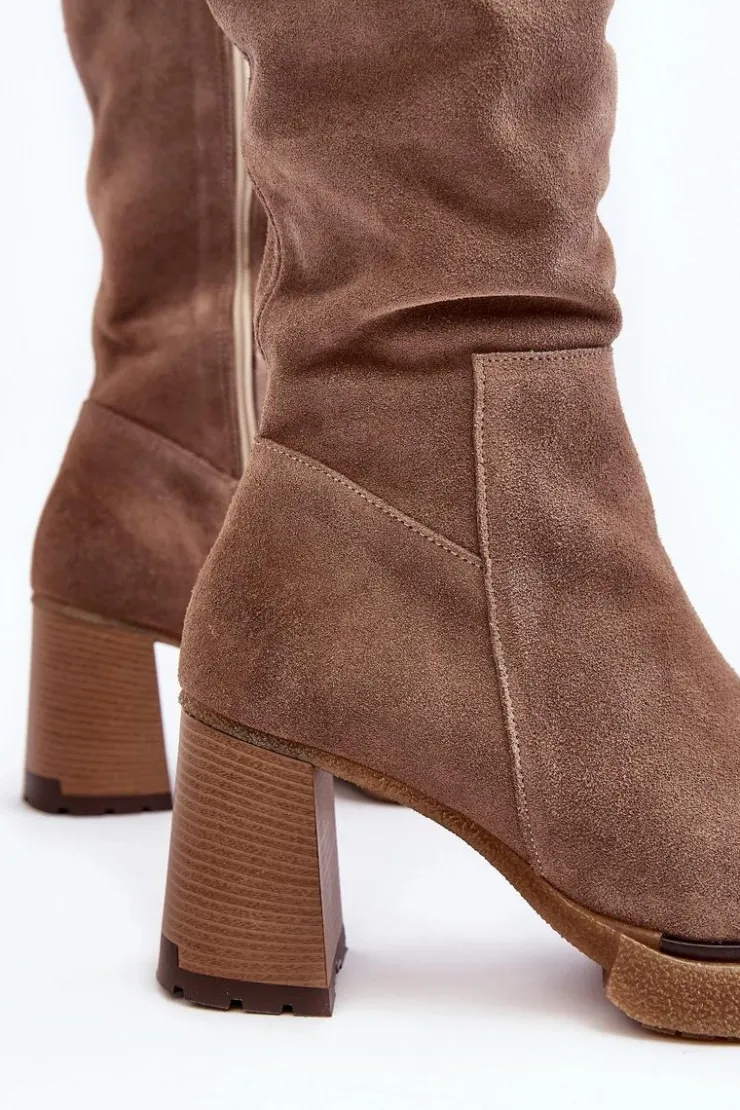 Damskie Boto Zamszowe Kozaki Damskie Na Słupku Przed Kolano Brązowe Lemar Ceraxa