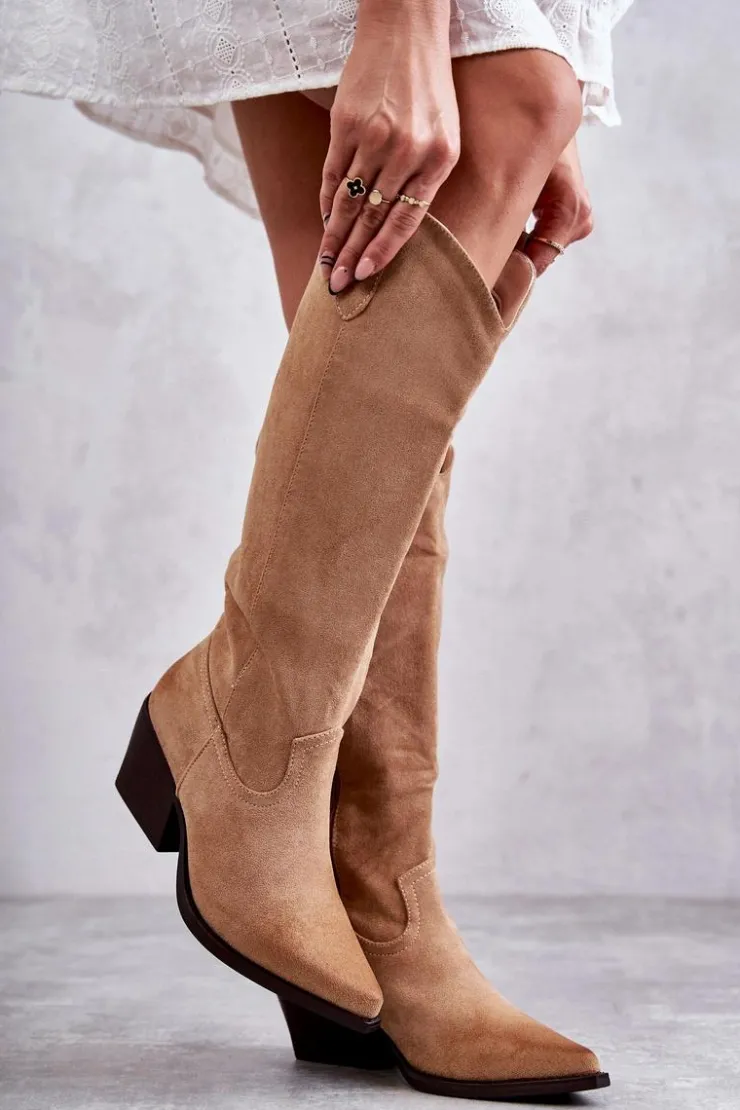 Kozaki – kowbojki zostały wykonane z przyjemnego w dotyku eko zamszu. Posiadają delikatne przeszycia na przodzie. Kozaki o fasonie kowbojek posiadają nosek w szpic oraz masywny obcas w postaci słupka. Model wsuwany z dodatkowym suwakiem z boku cholewki. Wkładka wykonana z eko skóry. Kozaki posiadają usztywniany zapiętek. Ten wyjątkowy model powinien być właśnie Twój! Przy wyborze rozmiaru prosimy sugerować się tabelą rozmiarów.