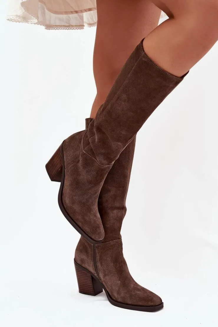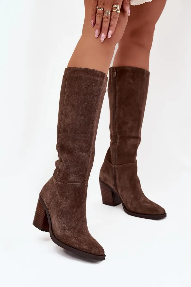 Zamszowe kozaki na słupku z zamkiem brązowe Lissara