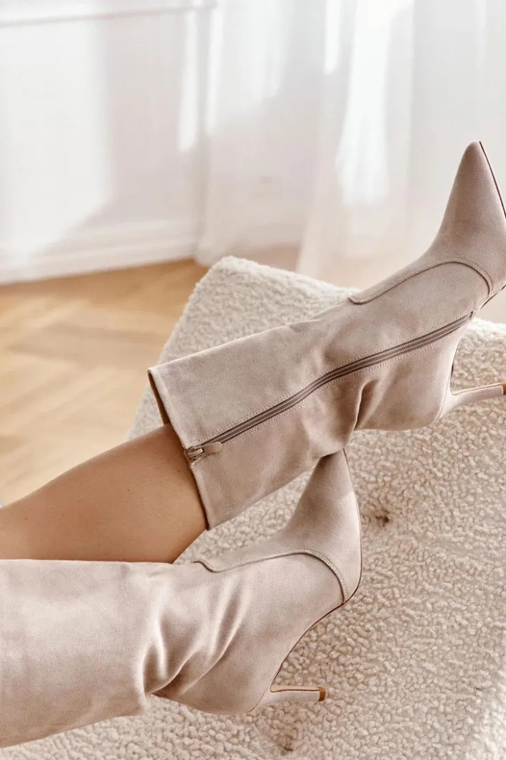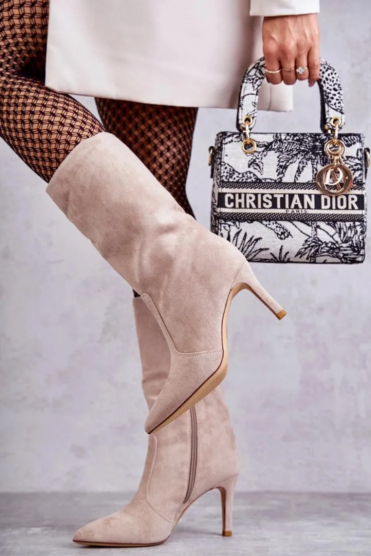Piękne kozaki z cholewką do połowy łydki. Zostały wykonane z eko zamszu. Osadzone na obcasie w postaci niewysokiej szpilki. Posiadają usztywniany zapiętek. Model z suwakiem na całej długości cholewki. Nosek w szpic optycznie wysmukli stopę. Na pewno wykorzystasz je w wielu stylizacjach! Idealne zarówno do sukienki, jak i spodni. Musisz je mieć! Przy wyborze rozmiaru prosimy sugerować się tabelą rozmiarów.