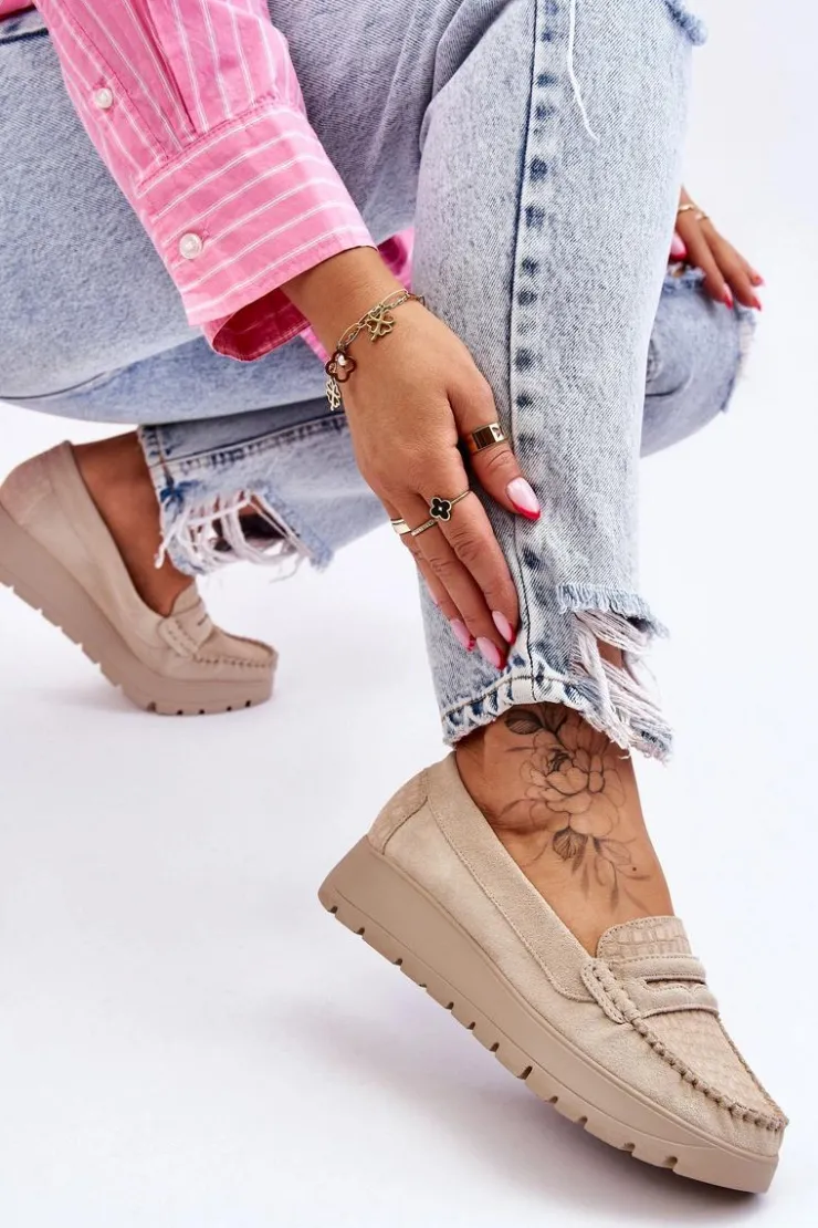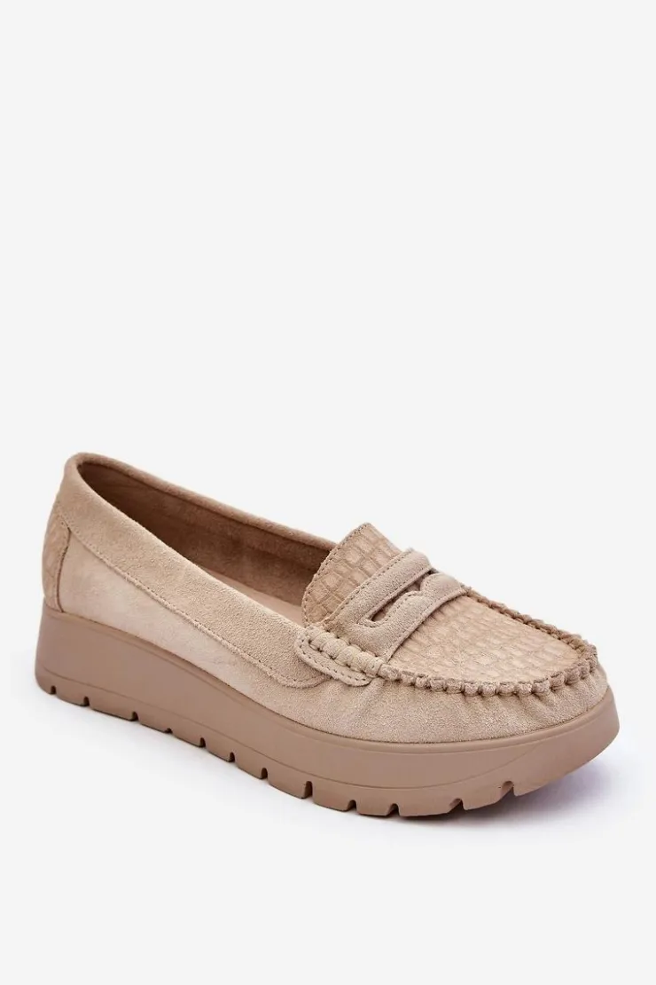 Mokasyny damskie wykonane z naturalnej skóry z ozdobnym paseczkiem z przodu. Zapiętek został usztywniony, co pozwoli na odpowiednią stabilizację stopy. Buty osadzono na platformie. Ten model posiada miękką wkładkę z perforacją. Mokasyny to idealne buty do wielu stylizacji! Koniecznie powinnaś je mieć! Przy wyborze rozmiaru prosimy sugerować się tabelą rozmiarów.