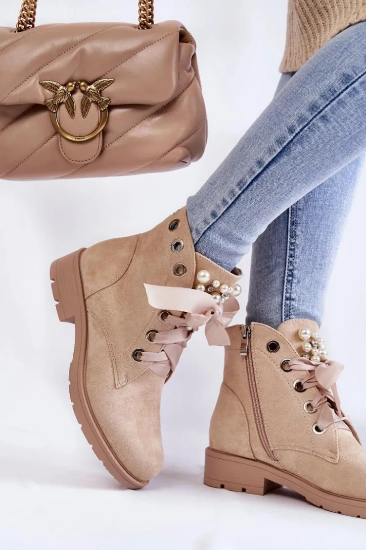 Damskie botki z pięknymi perełkami i dżetami imitującymi cyrkonie podkreślą każdą Twoją stylizację! Wykonane z eko skórzanych materiałów. Nieregularna cholewka została przyozdobiona metalowymi kółeczkami. Botki posiadają ocieplenie w postaci delikatnego koca obuwniczego. Osadzone na płaskim obcasie i delikatnej podeszwie. Ten świetny model nigdy nie wyjdzie z mody, dlatego powinnaś mieć te botki w swojej szafie! Przy wyborze rozmiaru prosimy sugerować się tabelą rozmiarów.