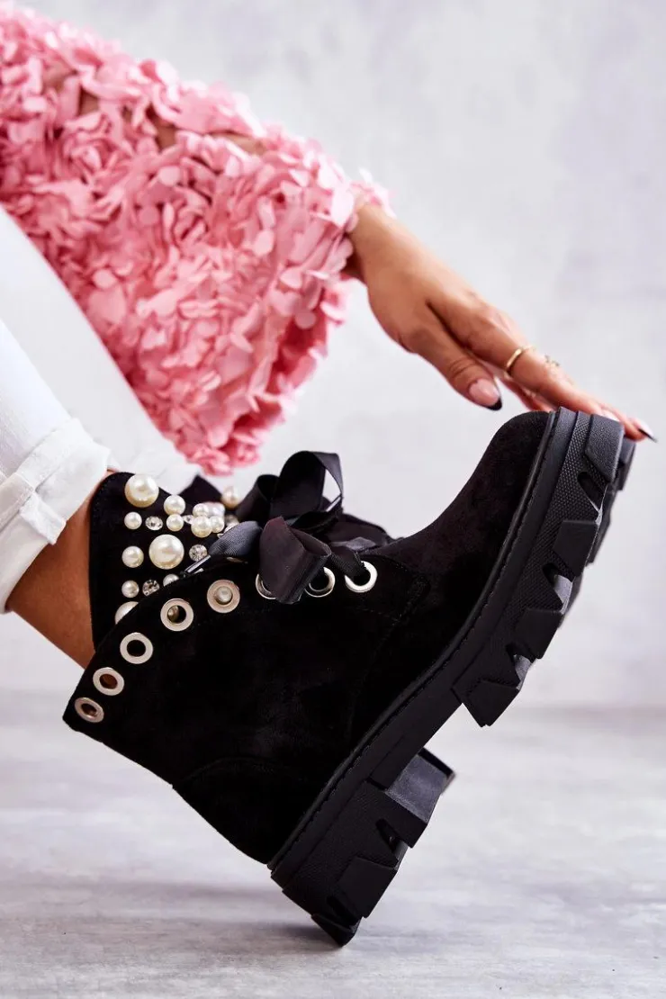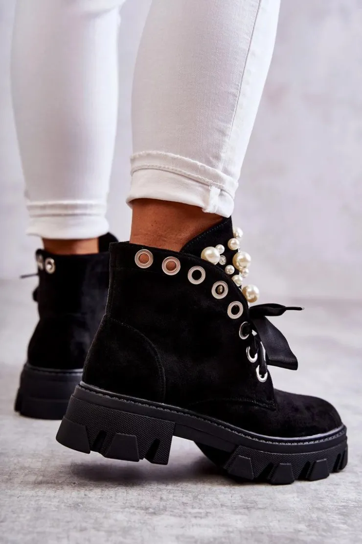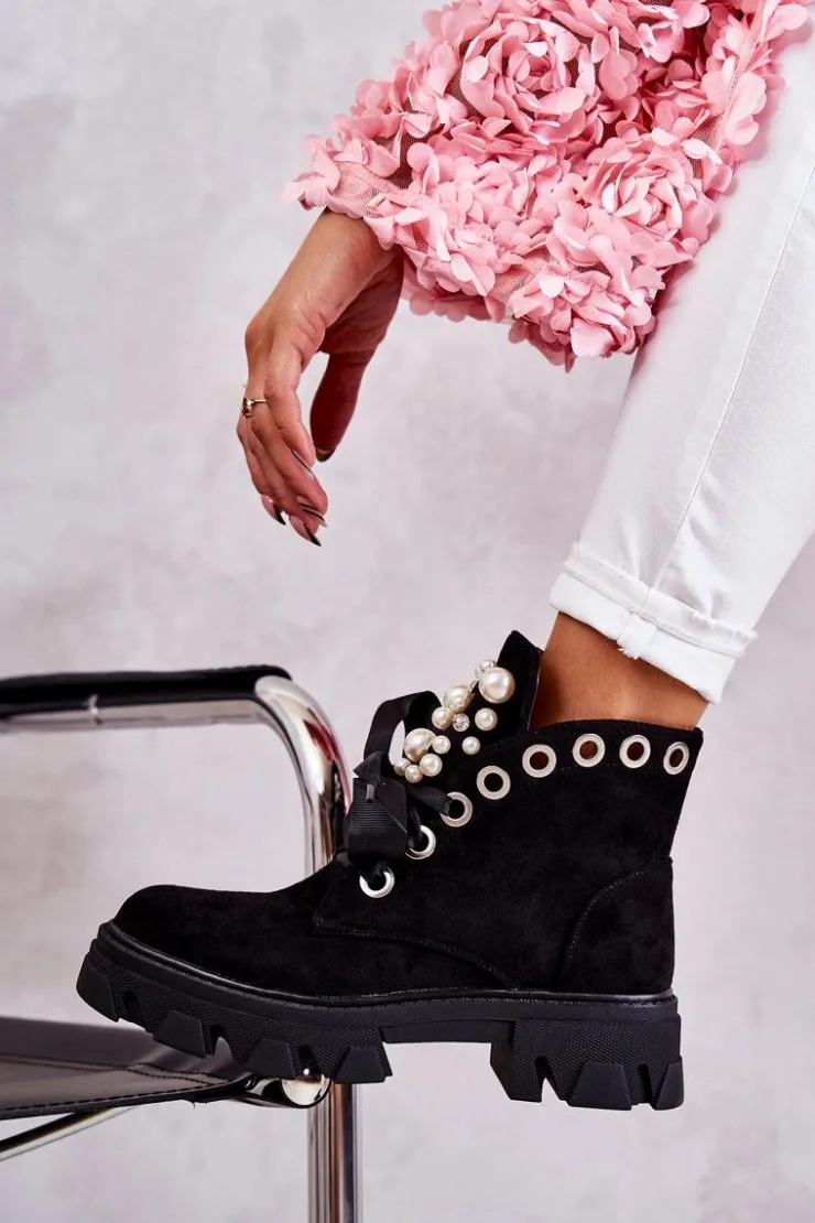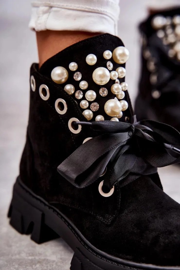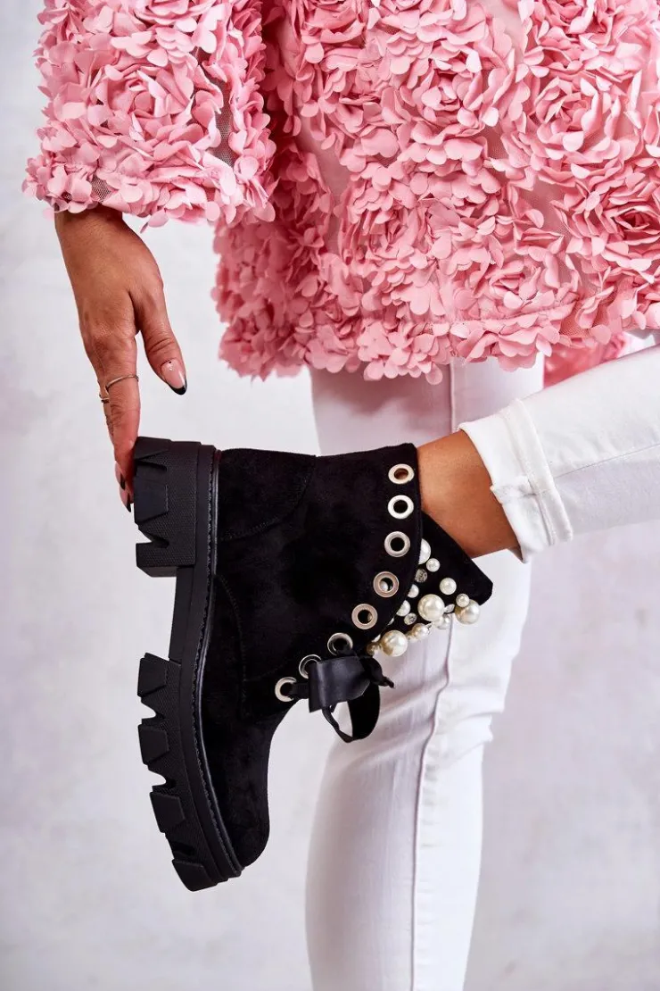 Wyjątkowe botki damskie wykonane z eko zamszu. Wnętrze ocieplone jest miłym w dotyku kocem obuwniczym. Model wyróżnia się krojem cholewki oraz elementami w postaci perełek i ćwieków. Ozdobna wstążka świetnie dopełnia całość. Zapinane także na suwak z boku cholewki. Osadzone na platformie i płaskim obcasie. Ten model musi być Twój! Nie czekaj dłużej aż zniknie! Przy wyborze rozmiaru prosimy sugerować się tabelą rozmiarów.