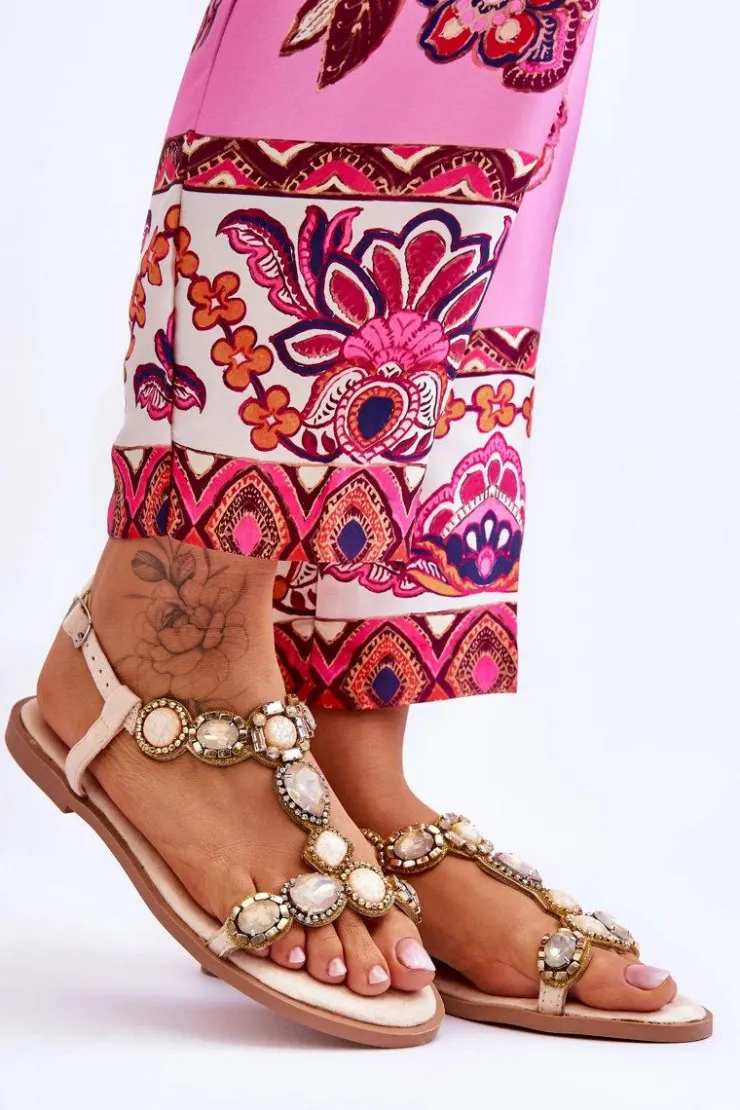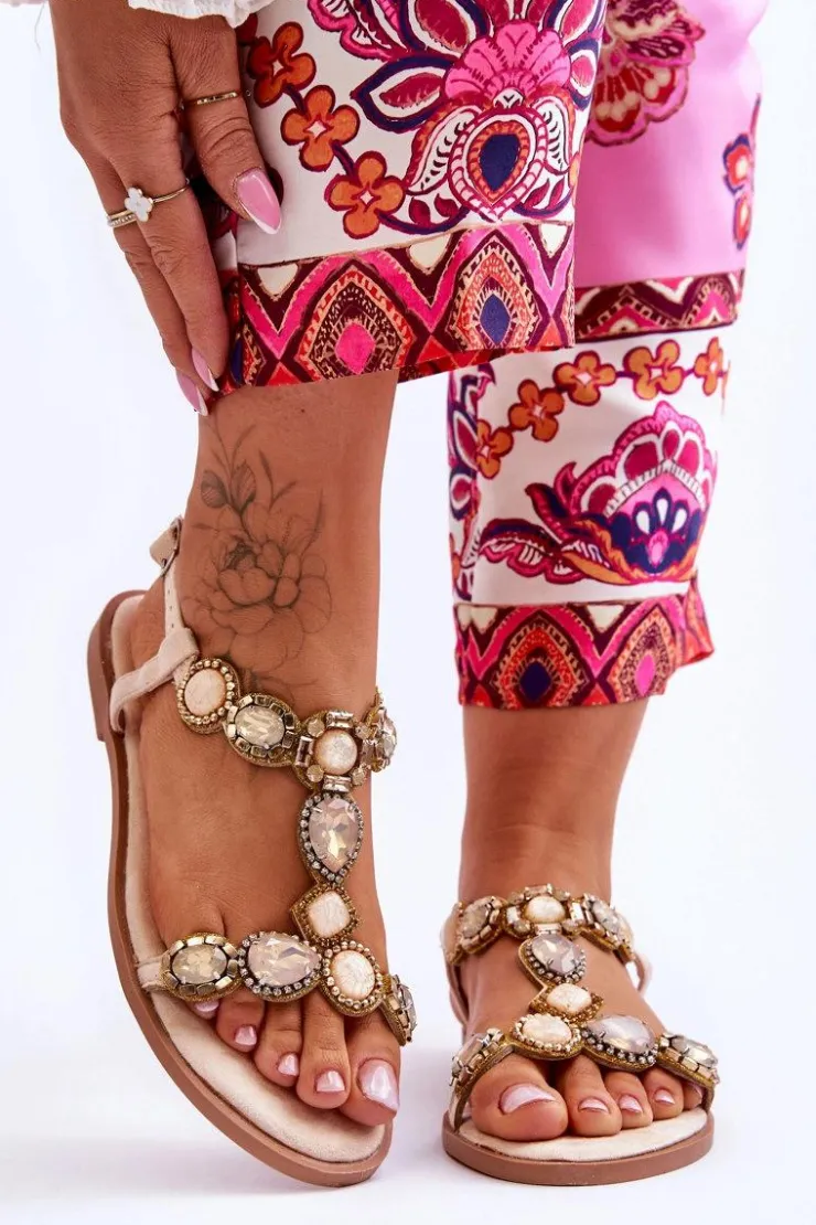 Piękne, damskie sandałki zostały wykonane z miłego w dotyku eko zamszu. Model ten posiada zdobienia w postaci brokatu, kamieni i mieniących się dżetów. Sandałki są zapinane na regulowany pasek ze sprzączką. Wygodna wkładka z eko zamszu świetnie sprawdzi się podczas długiego użytkowania obuwia. Sandałki osadzono na płaskim obcasie z antypoślizgową podeszwą. Przy wyborze rozmiaru prosimy kierować się tabelą rozmiarów.