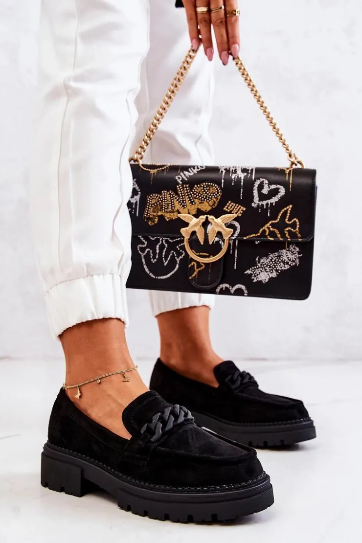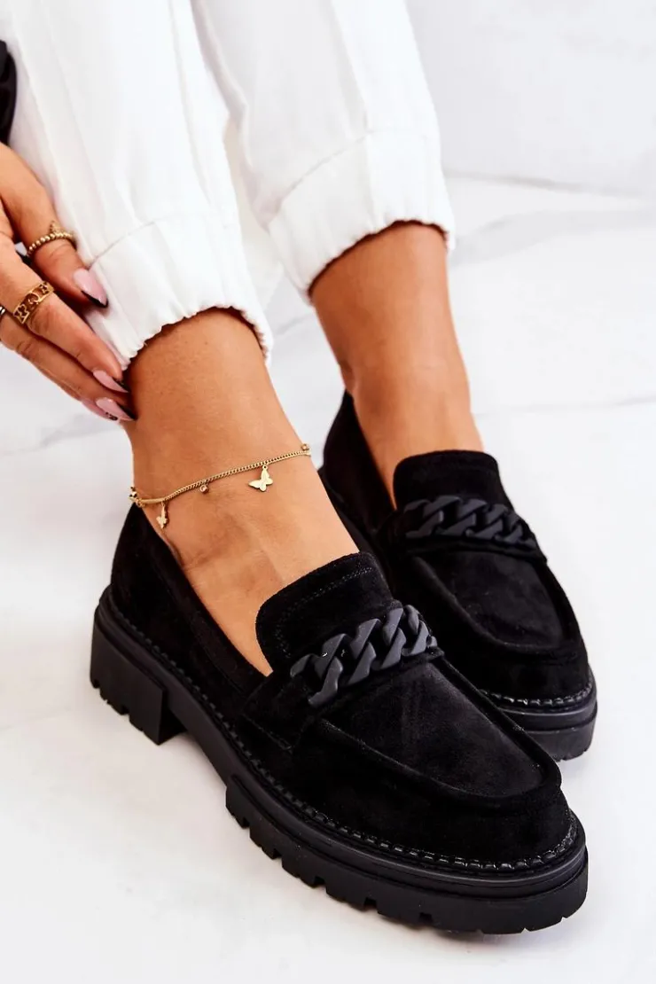 Klasyczne półbuty w stylu przepięknych loaferów marki Laura Fiore! Buty zostały wykonane z wysokiej jakości zamszowej eko skóry. Charakterystyczne zdobienie w postaci łańcucha sprawi, że stworzymy z nimi wiele wspaniałych stylizacji. Posiadają wysoką podeszwę oraz obcas, który uniesie naszą sylwetkę. Miękka wykonana z naturalnej skóry wkładka zadba o komfort podczas użytkowania obuwia. Przy wyborze rozmiaru prosimy sugerować się tabelą rozmiarów.