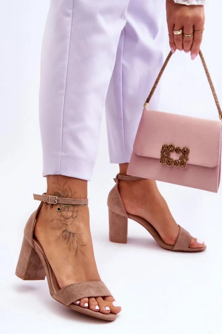 Klasyczne sandałki damskie osadzono na obcasie w postaci stabilnego słupka. Buty te zostały wykonane z eko zamszu. Nosek jest odkryty, zaokrąglony. Miękka wkładka z eko skóry zapewni komfort podczas użytkowania. Buty posiadają regulowany pasek zapinany na sprzączkę wokół kostki. Model ten wykorzystasz w wielu stylizacjach. Dodatkowo zapiętek został delikatnie usztywniony. Przy wyborze rozmiaru prosimy sugerować się tabelą rozmiarów.