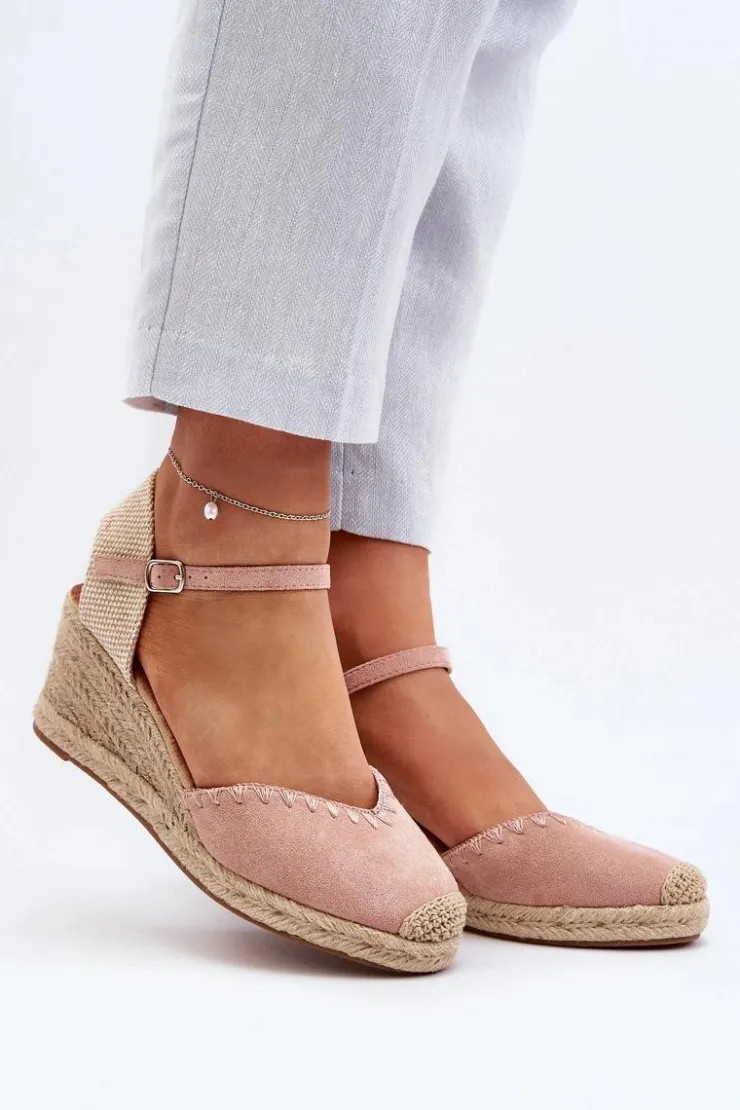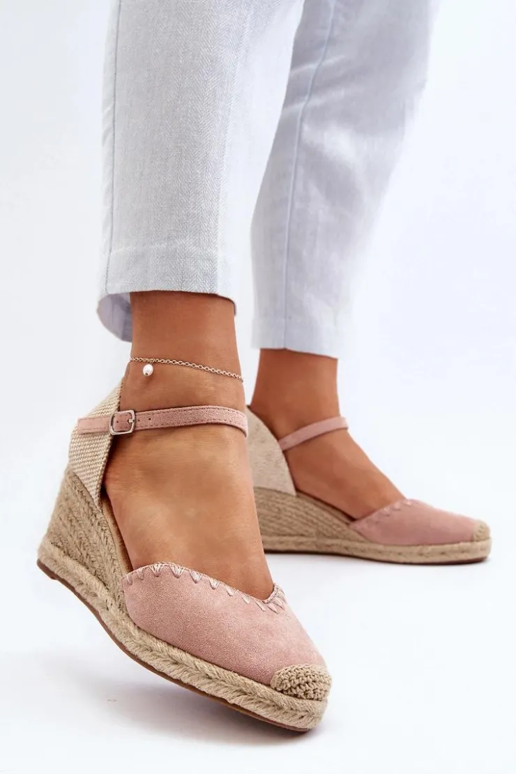 Sandały damskie w stylu espadryli. Wykonane z połączenia eko zamszu i tkaniny. Ich regulowany pasek zapinany na sprzączkę wokół kostki zapewnia idealne dopasowanie. Osadzone na koturnie i platformie zdobionej jutową plecionką, która dodaje subtelnego uroku i letniego charakteru. Miękka wkładka z eko zamszu gwarantuje komfort i wygodę podczas noszenia. Model ten to doskonały wybór na ciepłe dni! Przy wyborze rozmiaru prosimy sugerować się tabelą rozmiarów.