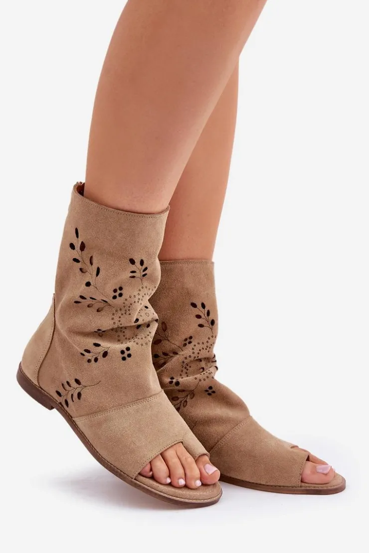 Te wyjątkowe sandały na płaskim obcasie to połączenie elegancji i wygody. Wykonane z wysokiej jakości naturalnego zamszu zapewniają trwałość i komfort noszenia. Ich cholewka, zapinana na zamek, ozdobiona jest ażurowym wzorem, który nadaje im delikatności i stylu. Doskonale sprawdzą się zarówno na co dzień, jak i na specjalne okazje, dodając Twojej stylizacji wyjątkowego uroku. Przy wyborze rozmiaru prosimy sugerować się tabelą rozmiarów.