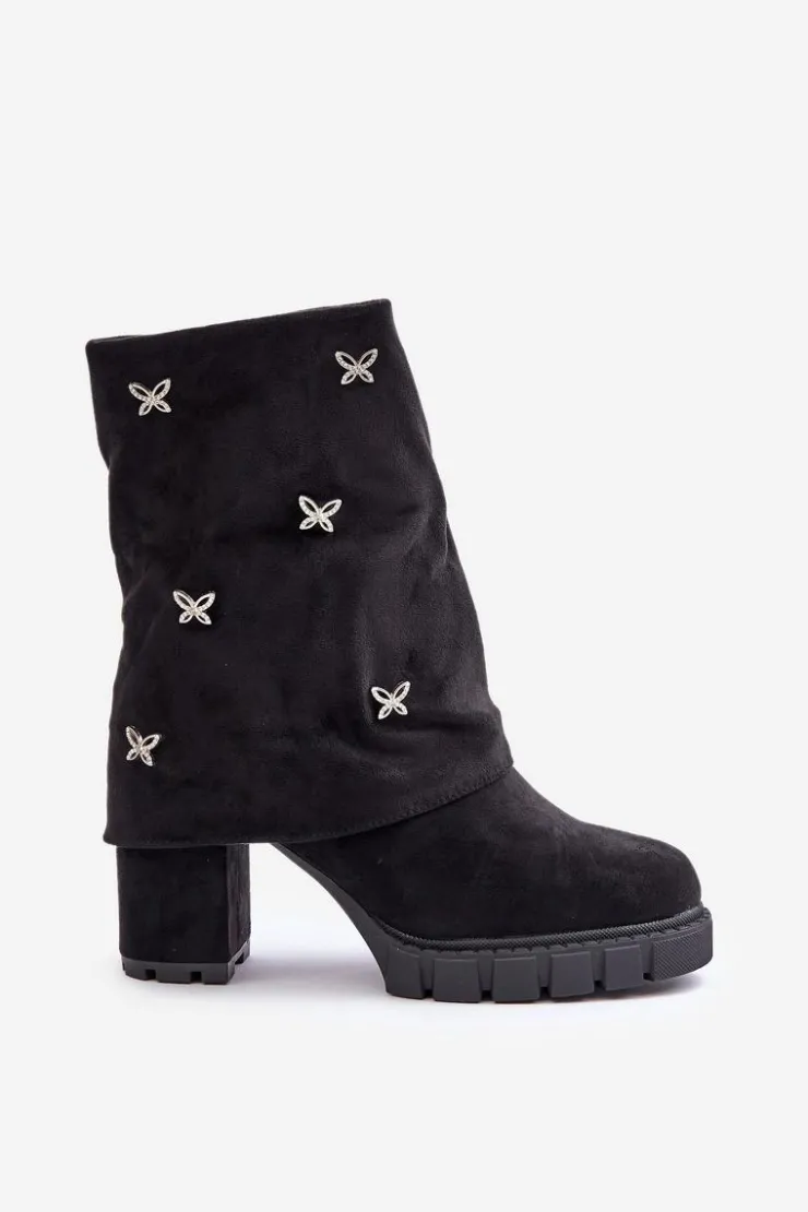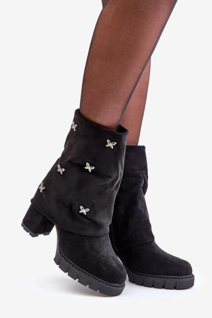 Botki damskie wykonane z eko zamszu. Model wyróżnia się zdobioną, wywiniętą cholewką, która zachodzi na stabilny obcas słupek, dodając im elegancji i nowoczesnego stylu. Zapinane na zamek, z ocieplanym wnętrzem, zapewniają wygodę i ciepło. Świetny wybór do stylizacji na sezon jesienno-zimowy. Przy wyborze rozmiaru prosimy sugerować się tabelą rozmiarów.