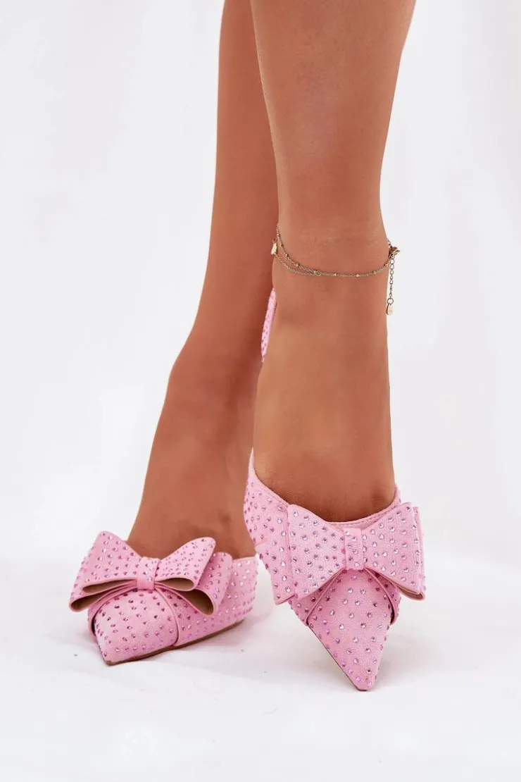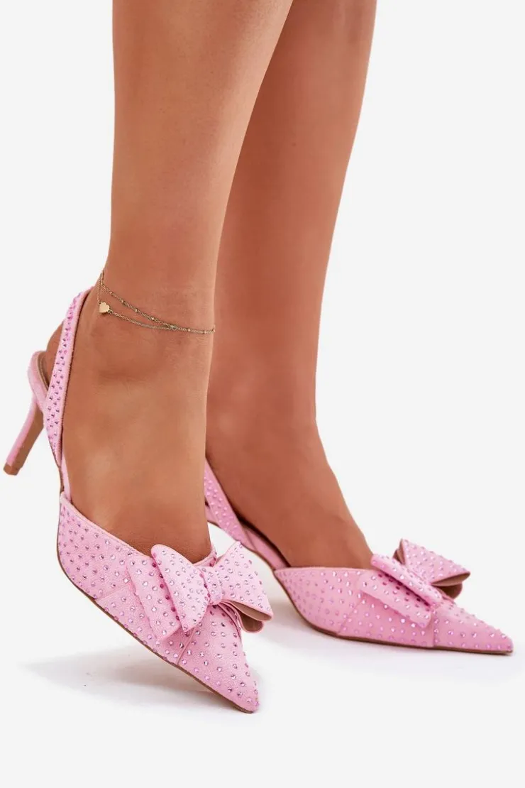 Zdobione szpilki damskie z odkrytą piętą to elegancka i stylowa propozycja na wyjątkowe okazje. Szpiczaste noski podkreślają smukłość sylwetki, a kokardka z przodu dodaje uroku i subtelności. Miękka wkładka zapewnia komfort przez cały dzień, łącząc wygodę z modnym wyglądem. Idealne na wieczorne wyjścia, wesela czy inne formalne uroczystości. Przy wyborze rozmiaru prosimy sugerować się tabelą rozmiarów.