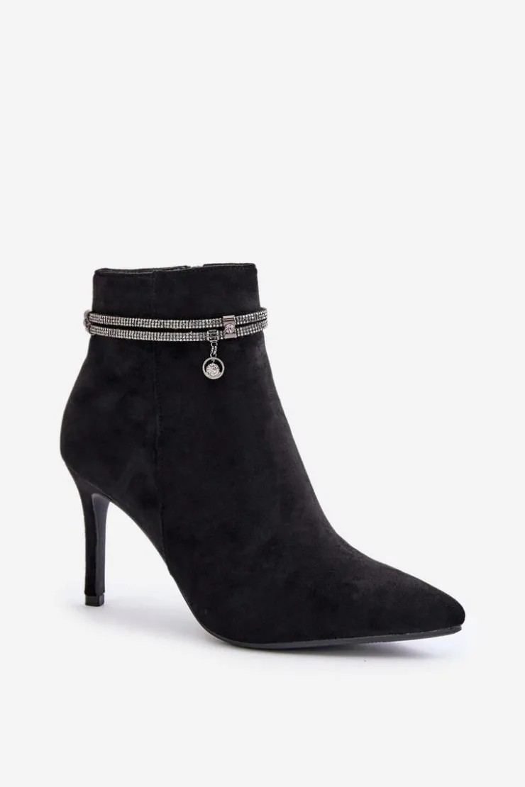 Eleganckie botki damskie wykonane z eko zamszu. Osadzone na obcasie w postaci szpilki. Na cholewce dwa zdobione paski, które nadają wyjątkowego uroku. Model zapinany na suwak z boku. Noski w szpic optycznie wysmuklą nogi. Dodatkowo zapiętek jest usztywniony. Idealnie sprawdzą się na wieczorne wyjścia! Przy wyborze rozmiaru prosimy sugerować się tabelą rozmiarów.