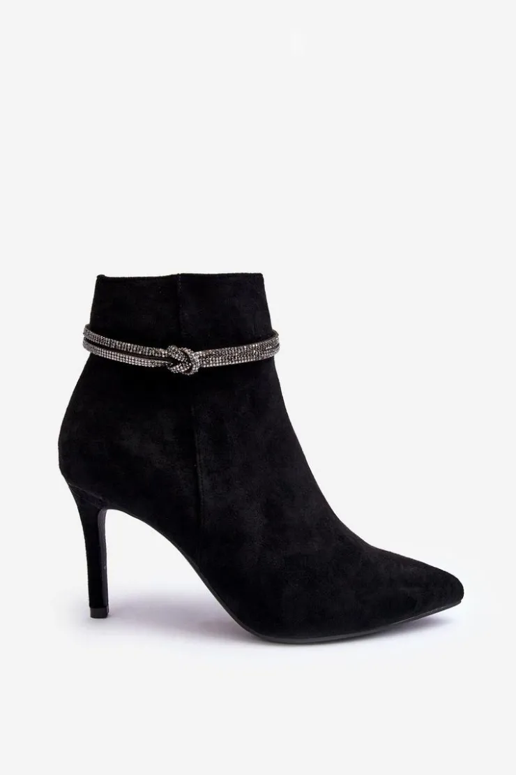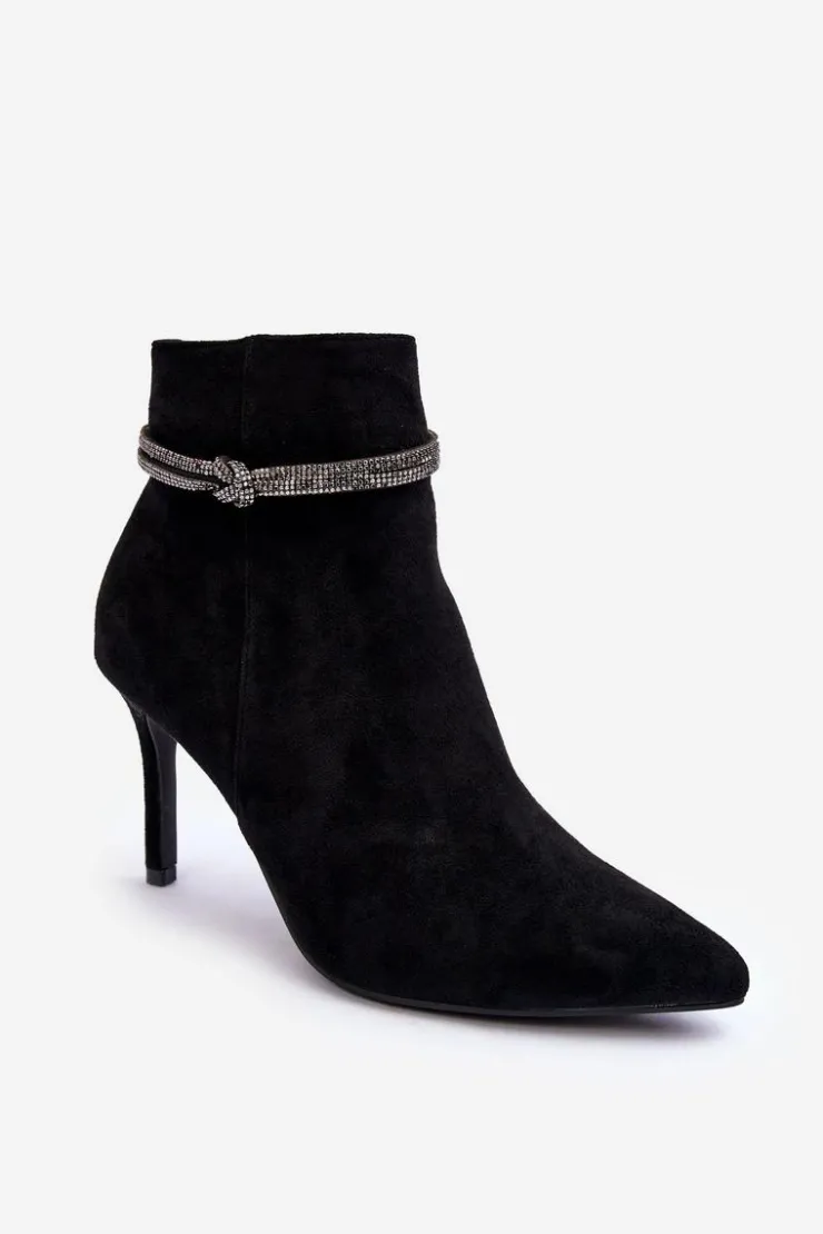 Botki damskie wykonane z eko zamszu. Osadzone na obcasie w postaci szpilki. Na cholewce dwa splecione paseczki, które posiadają liczne, błyszczące dżety. Model zapinany na suwak z boku. Noski w szpic optycznie wysmuklą nogi. Dodatkowo zapiętek jest usztywniony. Botki świetnie sprawdzą się w wielu stylizacjach np.: do sukienek, spódnic czy spodni. Koniecznie powinny znaleźć się w Twojej szafie! Przy wyborze rozmiaru prosimy sugerować się tabelą rozmiarów.