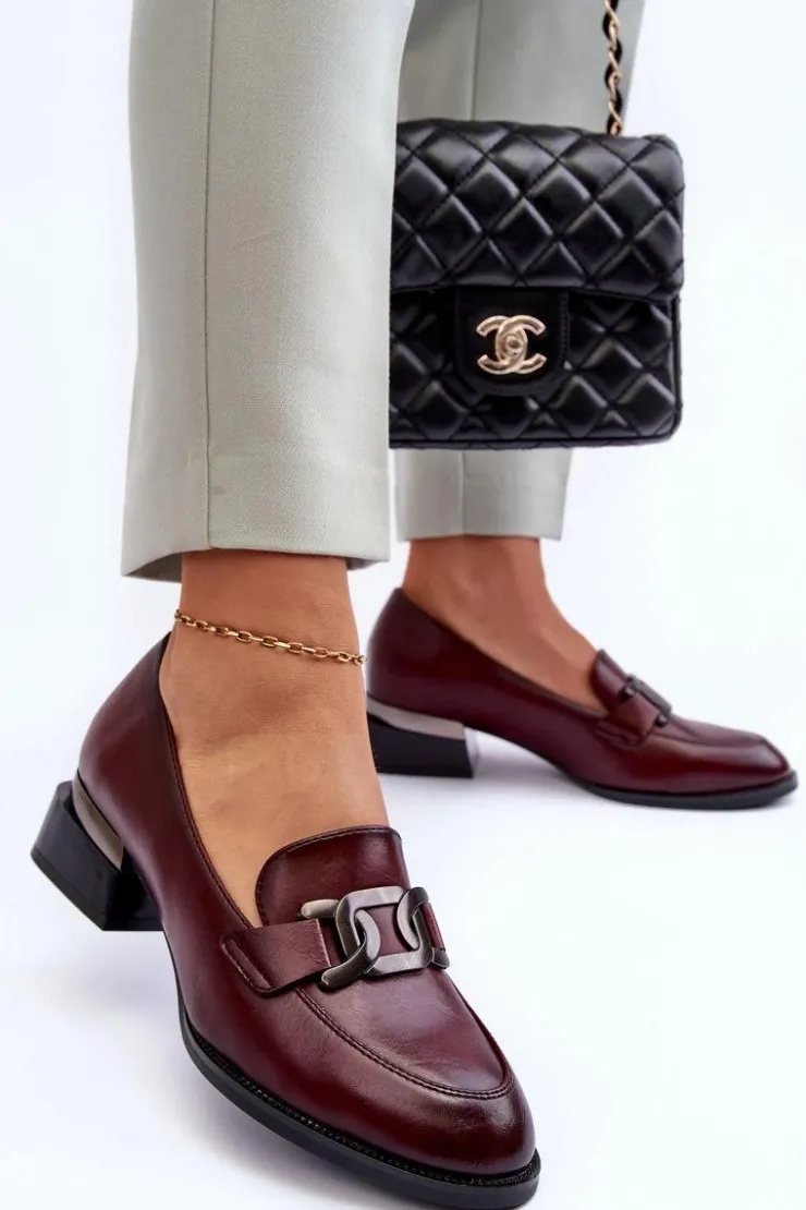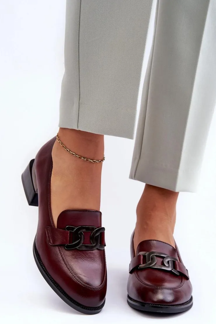 Eleganckie półbuty damskie osadzone na obcasie w postaci niskiego klocka. Wkładka ze skóry naturalnej zapewni komfort użytkowania. Nosek w kształcie migdała. Z przodu ozdobny łańcuch, który doda elegancji. Cholewka wykonana z eko skóry. Koniecznie musisz je mieć! Nie czekaj dłużej! Przy wyborze rozmiaru prosimy sugerować się tabelą rozmiarów.