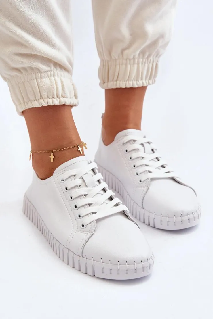 Trampki damskie wykonane z wysokiej jakości naturalnej skóry, co gwarantuje trwałość i komfort noszenia. Ich klasyczny design pozwala na łatwe dopasowanie do różnych stylizacji, a sznurowanie zapewnia pewne trzymanie stopy. Dodatkowo buty posiadają antypoślizgową podeszwę, co sprawia, że są one bezpieczne i stabilne nawet na różnych rodzajach nawierzchni. Wkładka z naturalnej skóry zapewnia dodatkowy komfort podczas długiego noszenia. Model ten to absolutny must-have w Twojej kolekcji obuwia! Przy wyborze rozmiaru prosimy sugerować się tabelą rozmiarów.